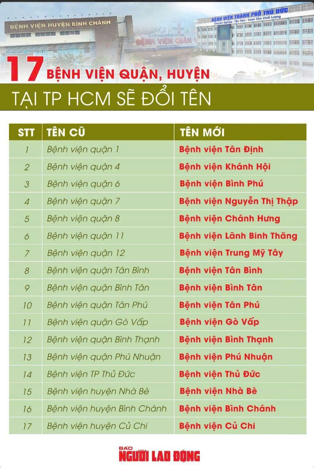 Theo đó, bên cạnh những bệnh viện có tên hoàn toàn mới, một số bệnh viện giữ nguyên tên địa danh nhưng bỏ từ “quận” hoặc “huyện”, như Bệnh viện quận Bình Tân đổi thành Bệnh viện Bình Tân, Bệnh viện quận Gò Vấp đổi thành Bệnh viện Gò Vấp…