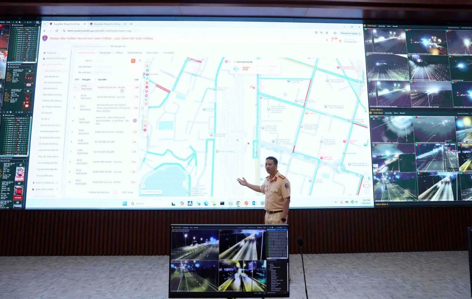 Sáng 17/7, hơn 10 cán bộ, chiến sĩ của Cục Cảnh sát giao thông (CSGT), Bộ Công an cùng các đơn vị phối hợp vẫn ứng trực tại Trung tâm thông tin chỉ huy. Công việc của họ chia làm các ca, đảm bảo hoạt động 24/7. Thiếu tướng Đỗ Thanh Bình, Cục trưởng Cục Cảnh sát giao thông nhấn mạnh, đây là trung tâm quản trị cấp 1 của Cục Cảnh sát giao thông với những công nghệ hiện đại, kết hợp với ứng dụng trí tuệ nhân tạo (AI).
