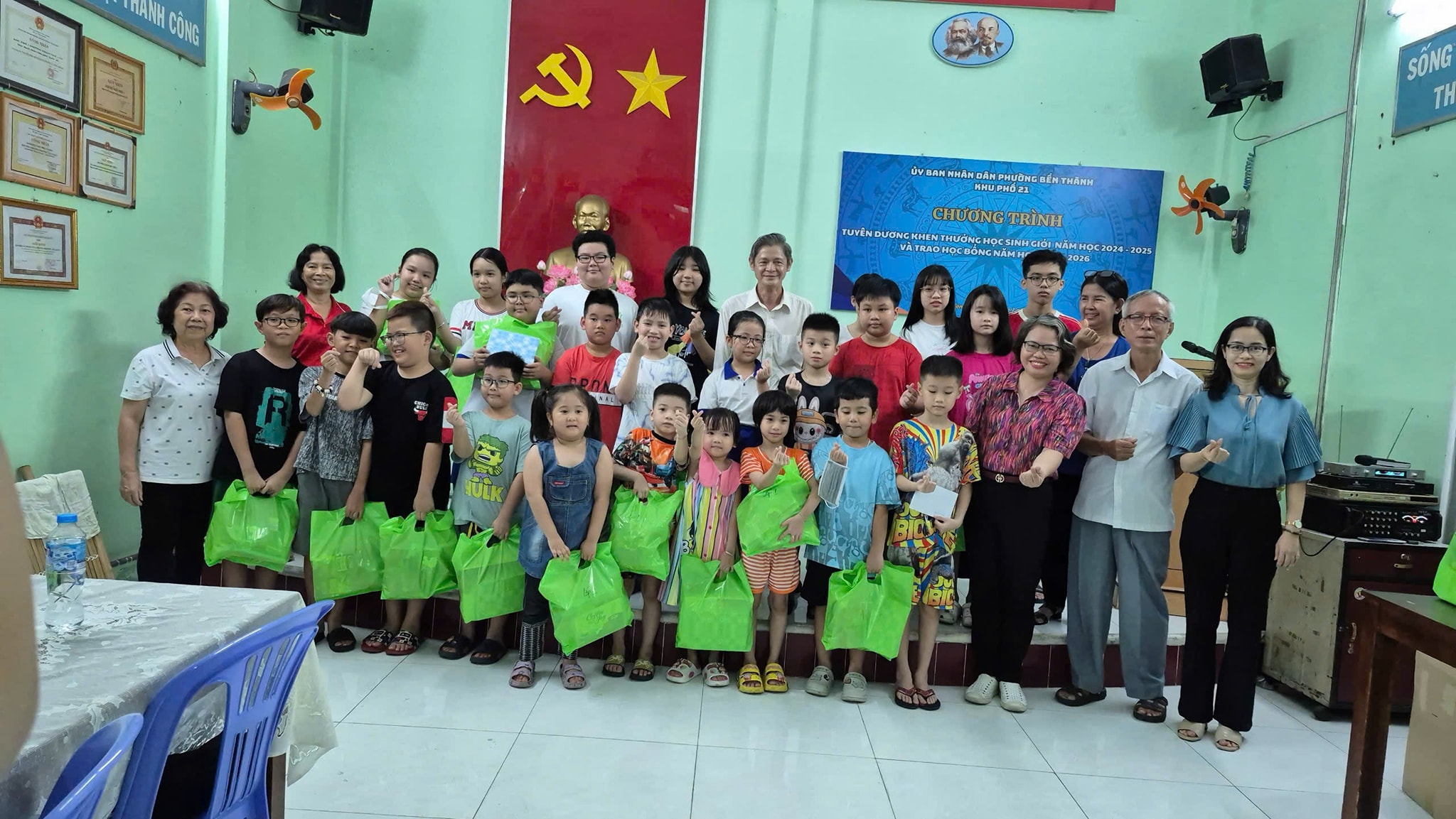 Tối ngày 18/7/2025, Chi bộ – Khu phố – Ban Công tác Mặt trận Khu phố 21 phường Bến Thành tổ chức Lễ tuyên dương khen thưởng học sinh giỏi năm học 2024-2025 và trao tặng học bổng năm học 2025-2026 cho các em học sinh. Tham dự chương trình có các đồng chí: Nguyễn Thị Hồng Nhung – Phó Chủ tịch Ủy ban MTTQ Việt Nam, Chủ tịch Hội LHPN phường; Phạm Thị Phương Dung – Bí thư chi bộ khu phố; Lưu Văn Năng – Trưởng khu phố; Đặng Thị Tuyết Nhung – Trưởng Ban CTMT khu phố cùng các ông, bà là thành viên khu phố, đảng viên chi bộ, cảnh sát khu vực, quý phụ huynh và các em học sinh tham dự.