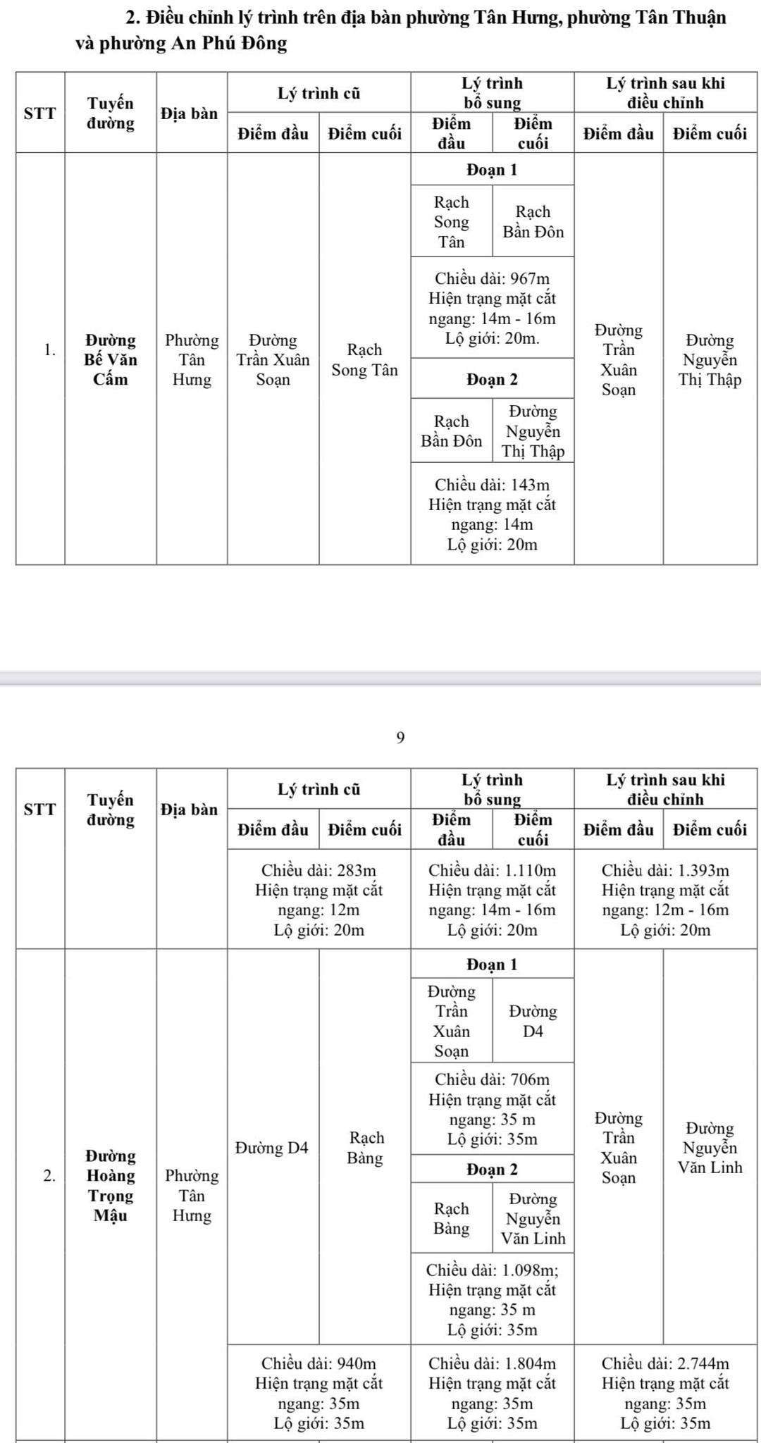 Danh sách các tuyến đường được đặt tên và điều chỉnh lý trình cụ thể như sau: