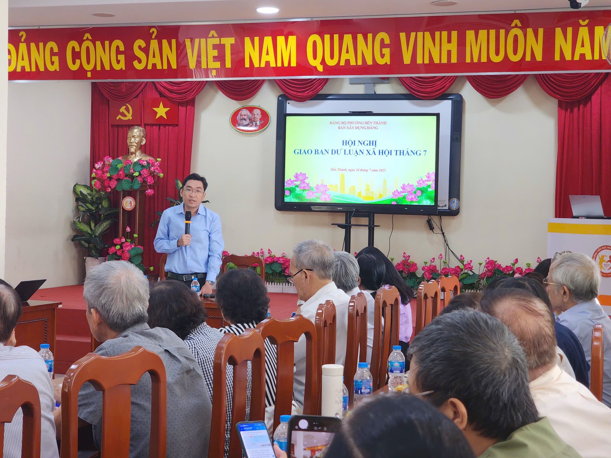 Ngày 24/7/2025, Ban Xây dựng Đảng phường Bến Thành tổ chức Hội nghị Giao ban dư luận xã hội tháng 7. Tham dự hội nghị có các đồng chí: Nguyễn Thanh Tuấn – Trưởng phòng Thông tin – Tổng hợp – Dư luận xã hội, Ban Tuyên giáo và Dân vận Thành ủy; Trần Đỗ Nam Long – Ủy viên Ban Thường vụ, Trưởng Ban Xây dựng Đảng; Bùi Thị Thúy Hiền – Phó Trưởng Ban Xây dựng Đảng; đại diện Ban Thường trực Ủy ban Mặt trận Tổ quốc Việt Nam; bí thư 27 chi bộ khu phố, đại diện Ban Chỉ huy Công an, Ban Chỉ huy Quân sự phường, lãnh đạo Phòng Văn hóa – xã hội, Phòng Kinh tế, Hạ tầng và Đô thị; Ban Quản lý chợ Bến Thành; Đảng ủy Công ty TNHH MTV dịch vụ Công ích Quận 1; Chi bộ Trường Tiểu học Nguyễn Thái Học và Trường Mầm non Bến Thành.