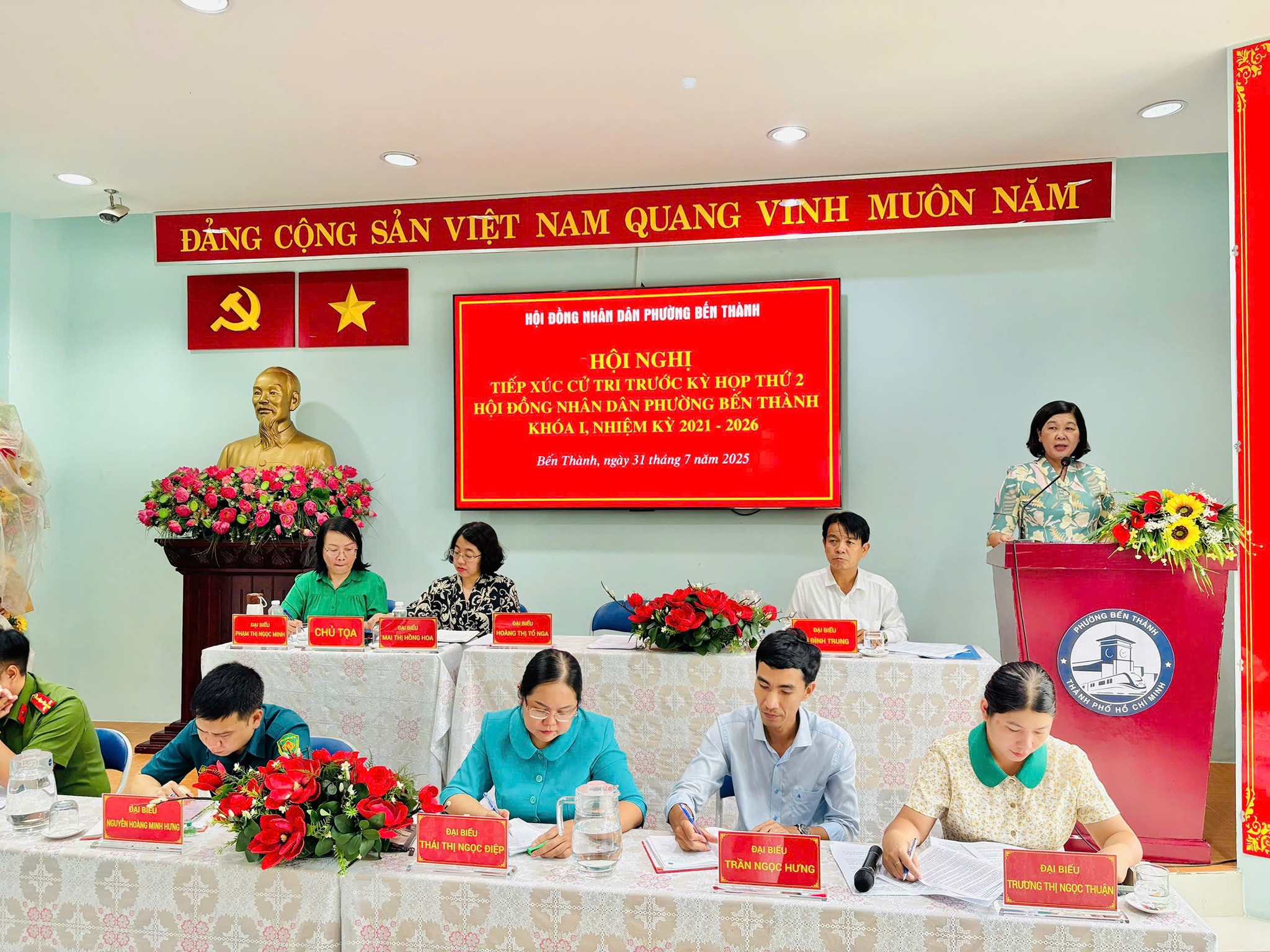 Ngày 31/7/2025, Hội đồng nhân dân – Ủy ban MTTQ Việt Nam phường Bến Thành phối hợp tổ chức Hội nghị tiếp xúc cử tri của đại biểu HĐND phường Bến Thành trước kỳ họp thứ hai, khóa I nhiệm kỳ 2021 – 2026; đồng thời kết hợp tổ chức Hội nghị nhân dân tháng 7 năm 2025. Tham dự hội nghị có các đồng chí: Hoàng Thị Tố Nga – Bí thư Đảng ủy, Chủ tịch Hội đồng nhân dân phường; Nguyễn Kim Đức – Phó Bí thư Thường trực Đảng ủy; Mai Thị Hồng Hoa – Phó Bí thư Đảng ủy, Chủ tịch UBND phường; Phạm Thị Ngọc Minh – Ủy viên Ban Thường vụ Đảng ủy, Chủ tịch Ủy ban MTTQ Việt Nam phường Bến Thành – chủ trì hội nghị. Cùng tham dự còn có Tổ Đại biểu HĐND phường; đại diện các phòng, ban, đơn vị, các tổ chức chính trị – xã hội phường và cử tri trên địa bàn phường Bến Thành.