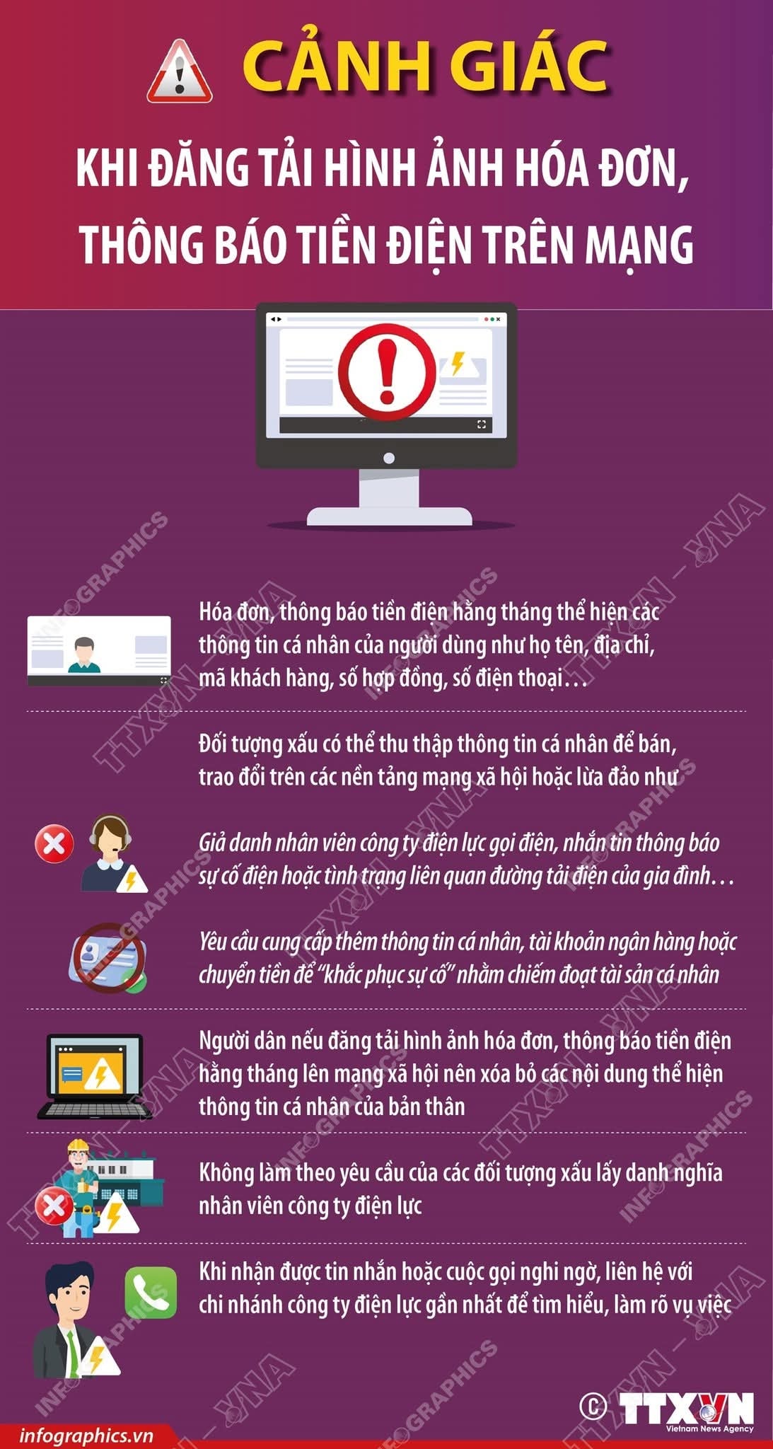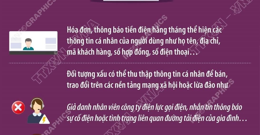 Theo Cơ quan Công an, thời gian gần đây, xuất hiện tình trạng người dân đăng tải hình ảnh hóa đơn, thông báo tiền điện hằng tháng trên các mạng xã hội, tiềm ẩn nguy cơ lộ lọt thông tin cá nhân dễ bị các đối tượng xấu lợi dụng.