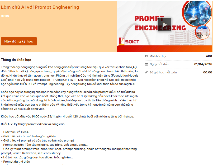 – Để xem chi tiết một khóa học, hãy bấm chuột vào tên khóa học mà bạn quan tâm. Trang thông tin khóa học sẽ hiện ra, bao gồm phần giới thiệu ngắn gọn về nội dung, mục tiêu và lộ trình học tập. Hãy đọc kỹ phần mô tả này để xem khóa học có phù hợp với nhu cầu và mục tiêu học tập của bạn không. Nếu thấy phù hợp, bạn bấm vào nút “Hãy đăng ký học” để chính thức tham gia khóa học đó.