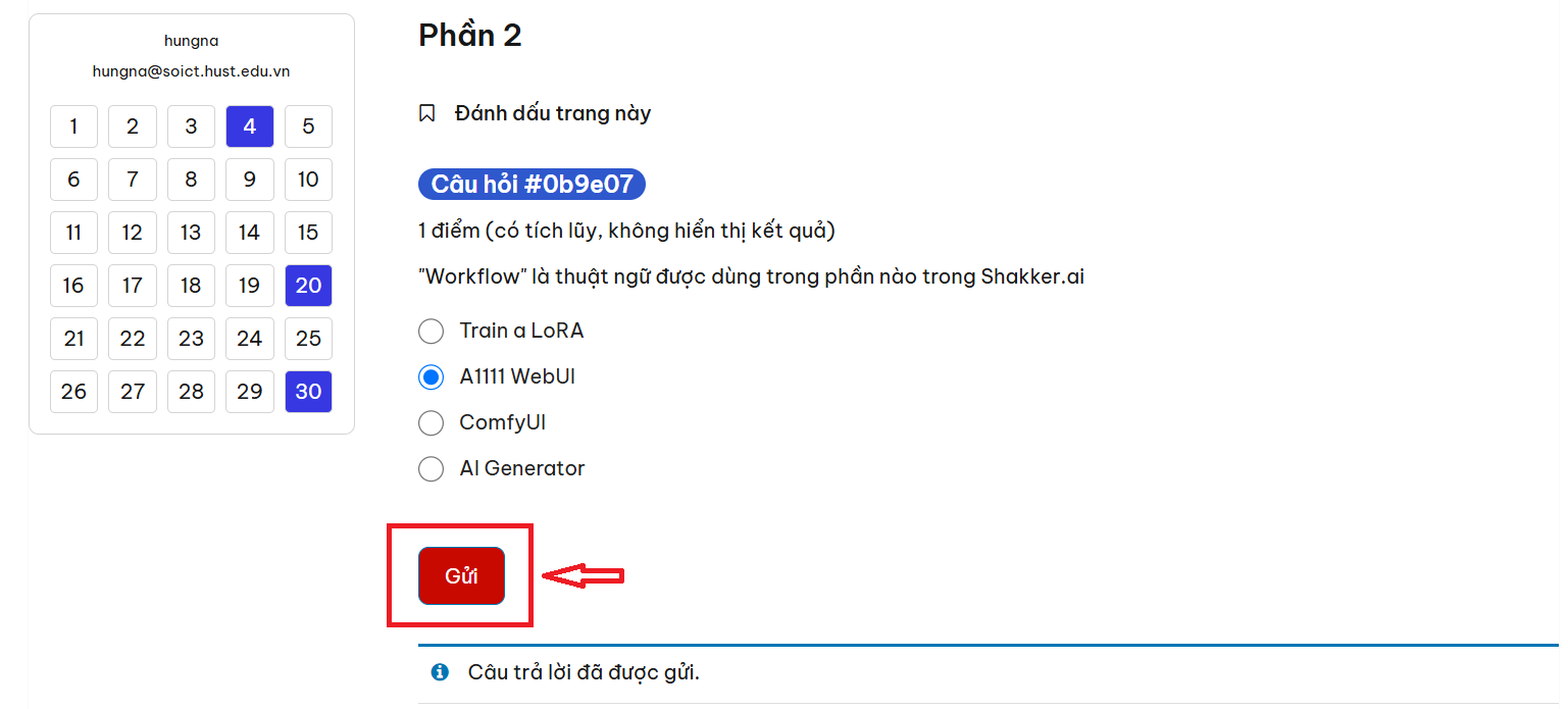 3. Sau khi bắt đầu, hệ thống sẽ hiển thị các câu hỏi. Học viên chọn đáp án đúng cho từng câu và bấm nút “Gửi” để hệ thống ghi nhận.