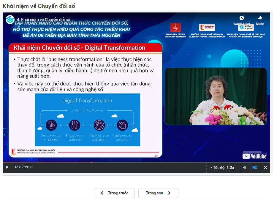 – Khi đến thời gian khóa học bắt đầu, các video bài giảng sẽ xuất hiện trong lộ trình môn học để người học có thể truy cập và học tập. Tương tự như khi xem tài liệu đọc trước, người học sử dụng các nút “Trang trước” và “Trang sau” để di chuyển đến các bài học có chứa video bài giảng. Người học cần học lần lượt từng bài từ đầu đến cuối, theo đúng thứ tự đã được thiết kế trong lộ trình. Chỉ khi hoàn thành xong bài học trước, hệ thống mới cho phép chuyển sang bài tiếp theo.