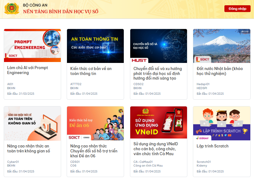 – Sau khi đăng nhập vào hệ thống, bạn sẽ thấy danh sách các khóa học hiện ra trên màn hình. Đây là những khóa học mà bạn có thể lựa chọn để đăng ký tham gia