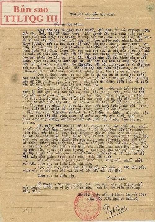 Ngày hôm nay là ngày khai trường đầu tiên ở Nước Việt Nam Dân chủ Cộng hòa. Tôi đã tưởng tượng thấy trước mắt cái cảnh nhộn nhịp tưng bừng của ngày tựu trường ở khắp các nơi. Các em hết thảy đều vui vẻ vì sau mấy tháng giời nghỉ học, sau bao nhiêu cuộc chuyển biến khác thường, các em lại được gặp thầy gặp bạn. Nhưng sung sướng hơn nữa, từ giờ phút này giở đi các em bắt đầu được nhận một nền giáo dục hoàn toàn Việt Nam.