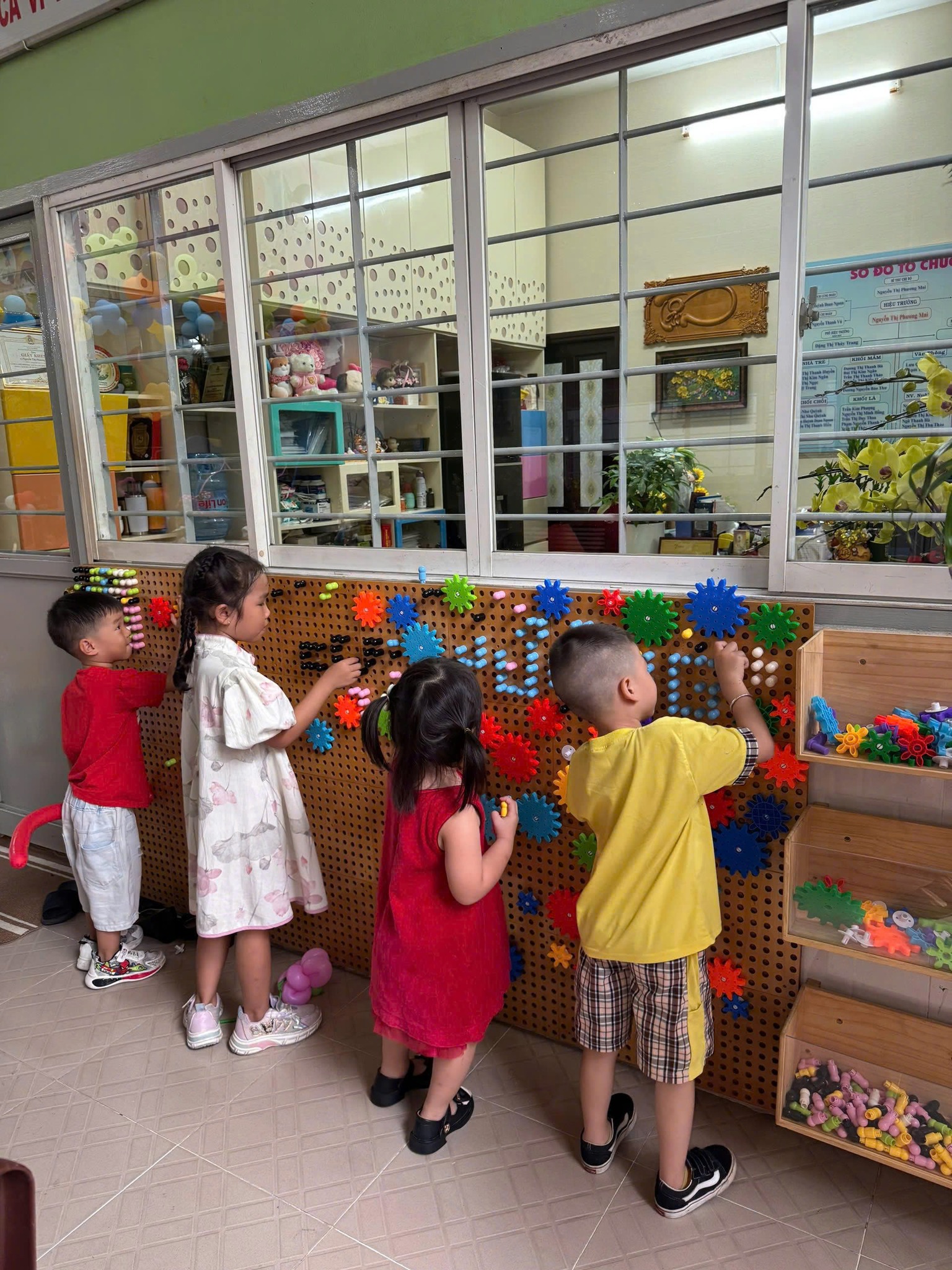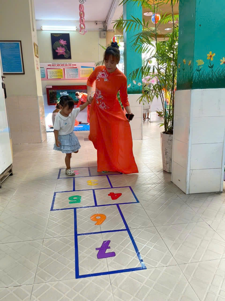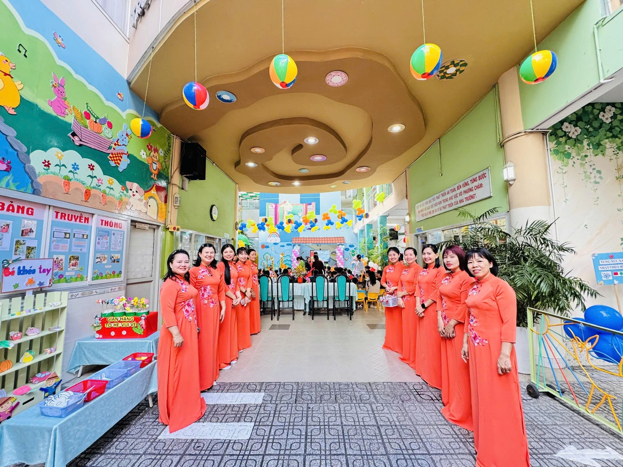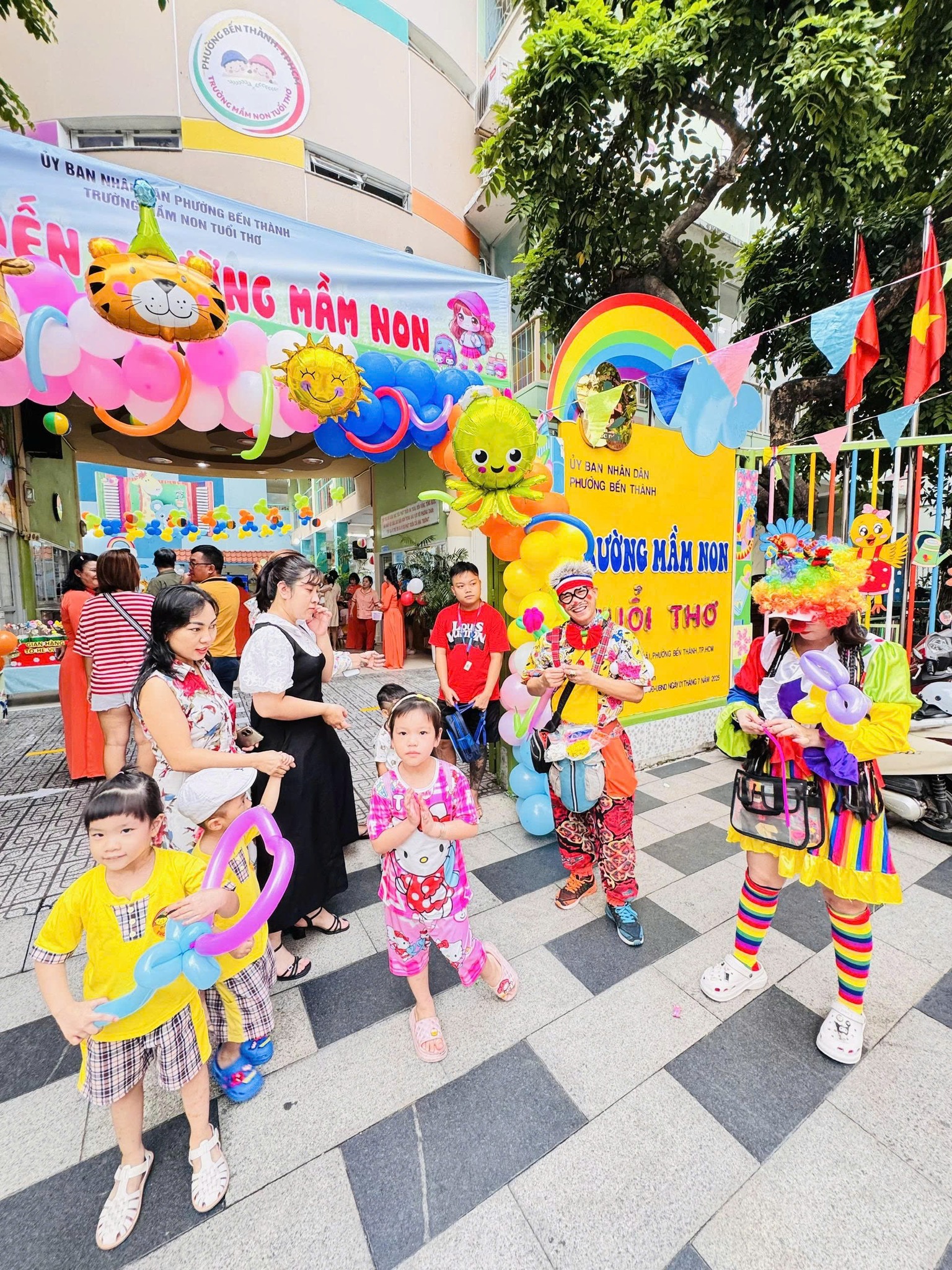 Nhà trường đã tổ chức các hoạt động vui tươi, hấp dẫn, an toàn phù hợp với trẻ mầm non, tạo không khí vui tươi, sinh động, gây ấn tượng cho trẻ trong ngày đầu đi học thông qua các hoạt động vui chơi tại sân trường như: tung xúc xắc nhảy theo hình (tròn, vuông, tam giác, chữ nhật); Nhảy lò cò; Ném vòng cổ chai; Đánh bóng vào golf, Ném bóng vào tổ ong, Ném bóng vào lon; Chơi “Trò chơi dân gian”: Bún thun, Ô ăn quan, Lựa đậu…; Góc “Trò chơi tạo hình” với các trò chơi: Tô màu: vòng tay, đồng hồ, vương miện; Nặn tò he; Gấp giấy: xe, nhà, con vật; Cắt dán NVL: dĩa giấy, ly nhựa…; và giao lưu giữa giáo viên – phụ huynh – học sinh tại lớp.
