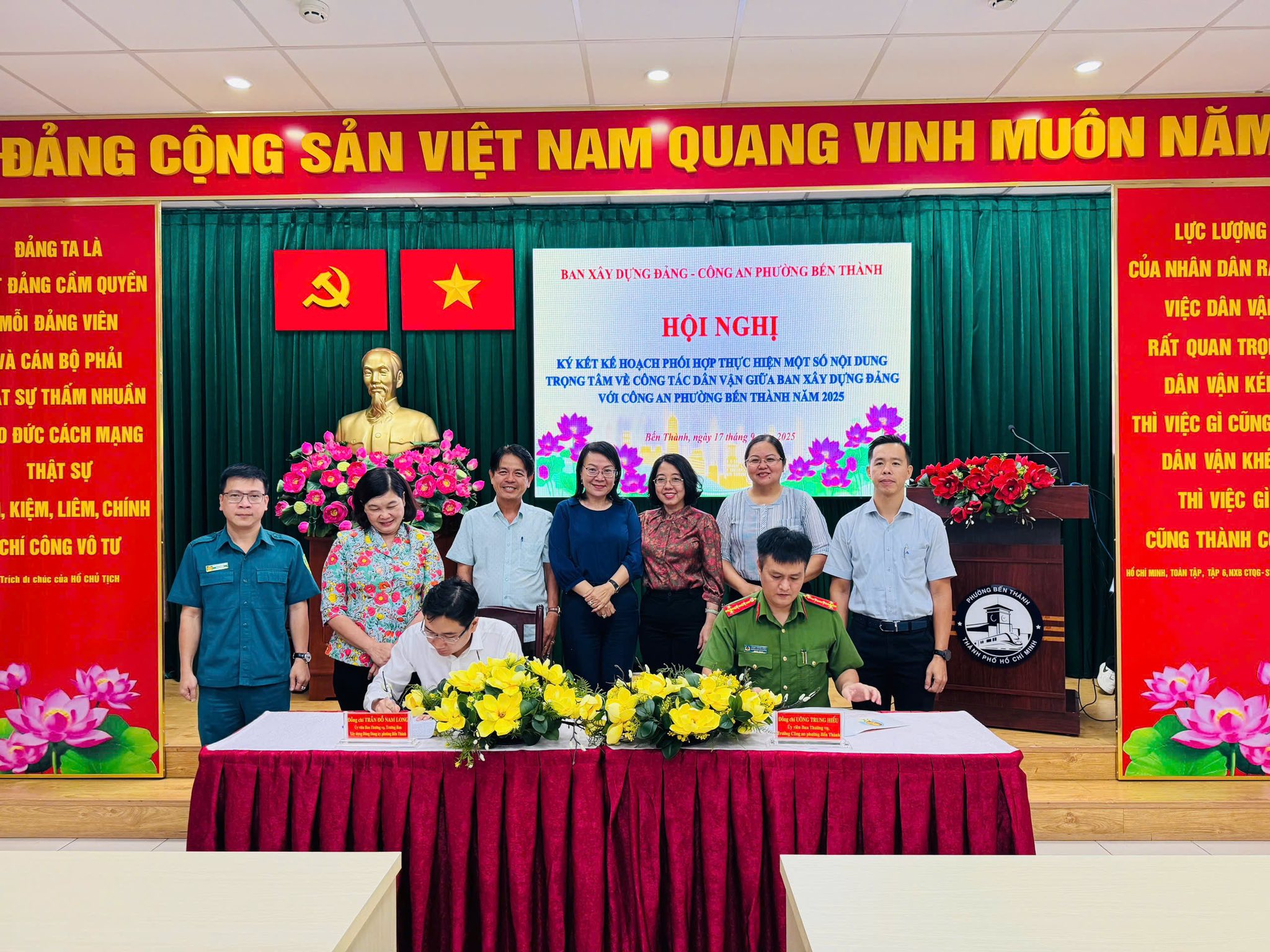 Ngày 17/9/2025, Ban Xây dựng Đảng phường Bến Thành tổ chức hội nghị ký kết phối hợp thực hiện một số nội dung trọng tâm về công tác dân vận giữa Ban Xây dựng Đảng với Công an phường Bến Thành năm 2025. Tham dự hội nghị có các đồng chí Hoàng Thị Tố Nga – Bí thư Đảng ủy, Chủ tịch HĐND phường; Nguyễn Kim Đức – Phó Bí thư Thường trực Đảng ủy; Mai Thị Hồng Hoa – Phó Bí thư Đảng ủy, Chủ tịch UBND phường; Phạm Thị Ngọc Minh – Ủy viên Ban Thường vụ, Chủ tịch Ủy ban Mặt trận Tổ quốc Việt Nam phường; Trần Đỗ Nam Long – Ủy viên Ban Thường vụ Đảng ủy, Trưởng Ban Xây dựng Đảng; Uông Trung Hiếu – Ủy viên Ban Thường vụ Đảng ủy, Trưởng Công an phường cùng các đồng chí trong Ban Thường vụ Đảng ủy phường.