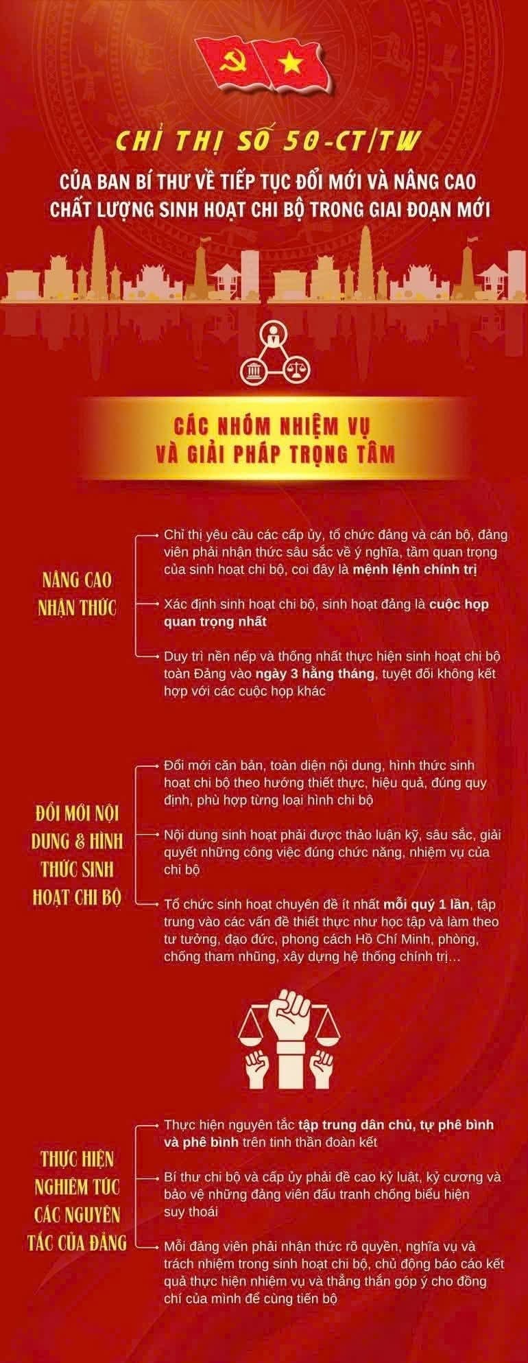 Sinh hoạt chi bộ là nơi giáo dục, bồi đắp lý tưởng cách mạng, rèn luyện bản lĩnh chính trị, đạo đức, lối sống cho đảng viên, là nơi triển khai thực hiện chủ trương, nghị quyết của Đảng thành hành động cụ thể, thiết thực trong từng lĩnh vực công tác, thực tiễn cuộc sống; là cầu nối giữa Đảng với Nhân dân, nắm bắt tâm tư, nguyện vọng của quần chúng. Mỗi cấp uỷ, tổ chức đảng và đội ngũ đảng viên phải xác định sinh hoạt chi bộ, sinh hoạt đảng là cuộc họp quan trọng nhất, thực hiện nghiêm túc chế độ sinh hoạt đảng theo Điều lệ Đảng, bảo đảm thời lượng sinh hoạt chi bộ, cấp uỷ; duy trì nền nếp sinh hoạt chi bộ, thống nhất thực hiện sinh hoạt chi bộ toàn Đảng vào ngày 03 hằng tháng (nếu vào ngày nghỉ hoặc trường hợp đặc biệt sinh hoạt trong tuần đầu tiên của tháng); tuyệt đối không được họp chi bộ kết hợp các cuộc họp khác. Kiên quyết chấn chỉnh, khắc phục triệt để những hạn chế trong sinh hoạt chi bộ kéo dài nhiều năm qua.