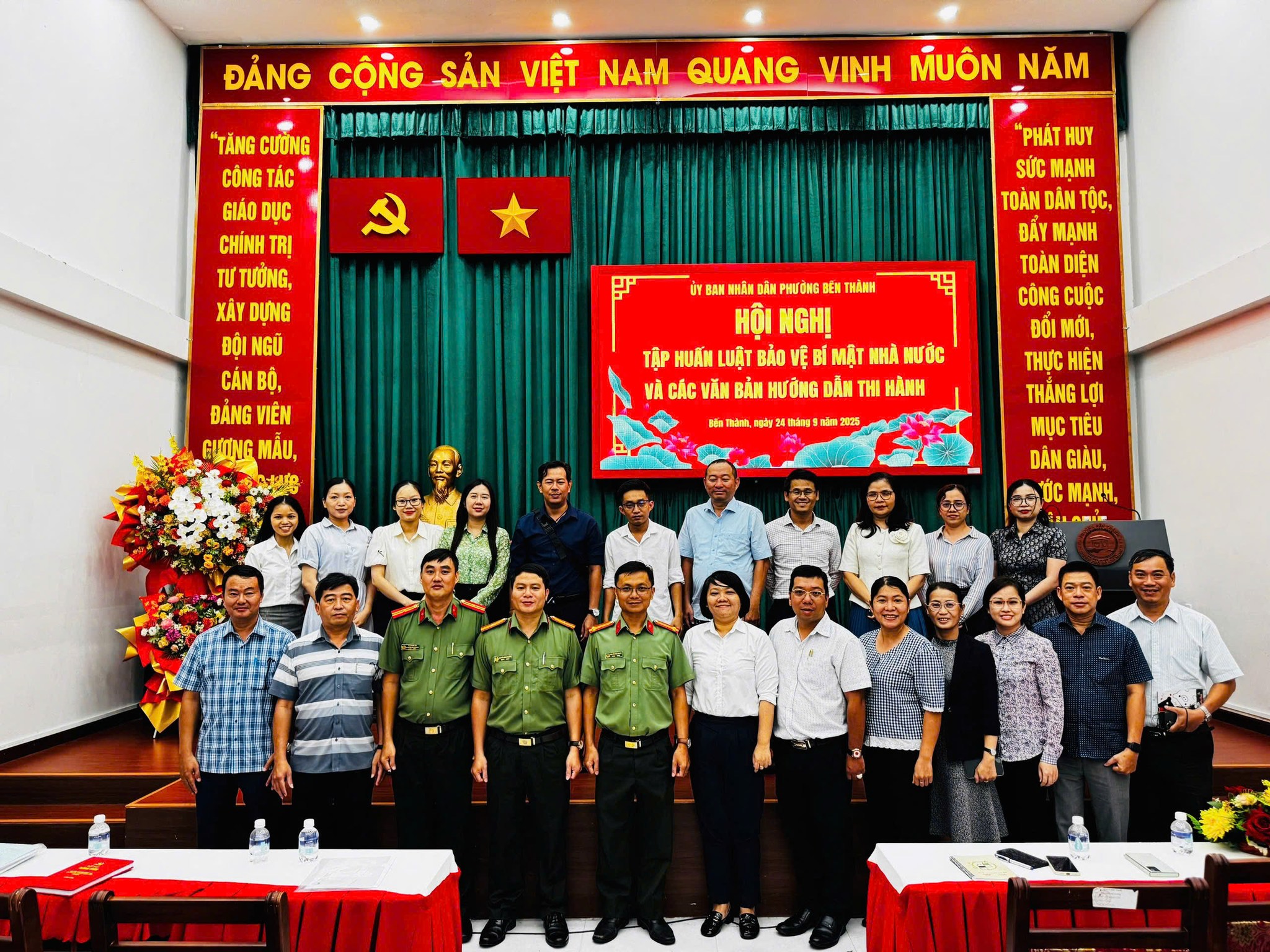 Sáng ngày 24/9/2025, UBND phường Bến Thành tổ chức Hội nghị tập huấn Luật Bảo vệ bí mật nhà nước và các văn bản hướng dẫn thi hành. Tham dự hội nghị có Trung tá Nguyễn Mậu Khiêm, Thiếu tá Nguyễn Minh Phương, cán bộ Phòng An ninh chính trị nội bộ Công an TP.HCM, cùng đại diện lãnh đạo Đảng ủy, HĐND, UBND, Ủy ban MTTQ Việt Nam phường.