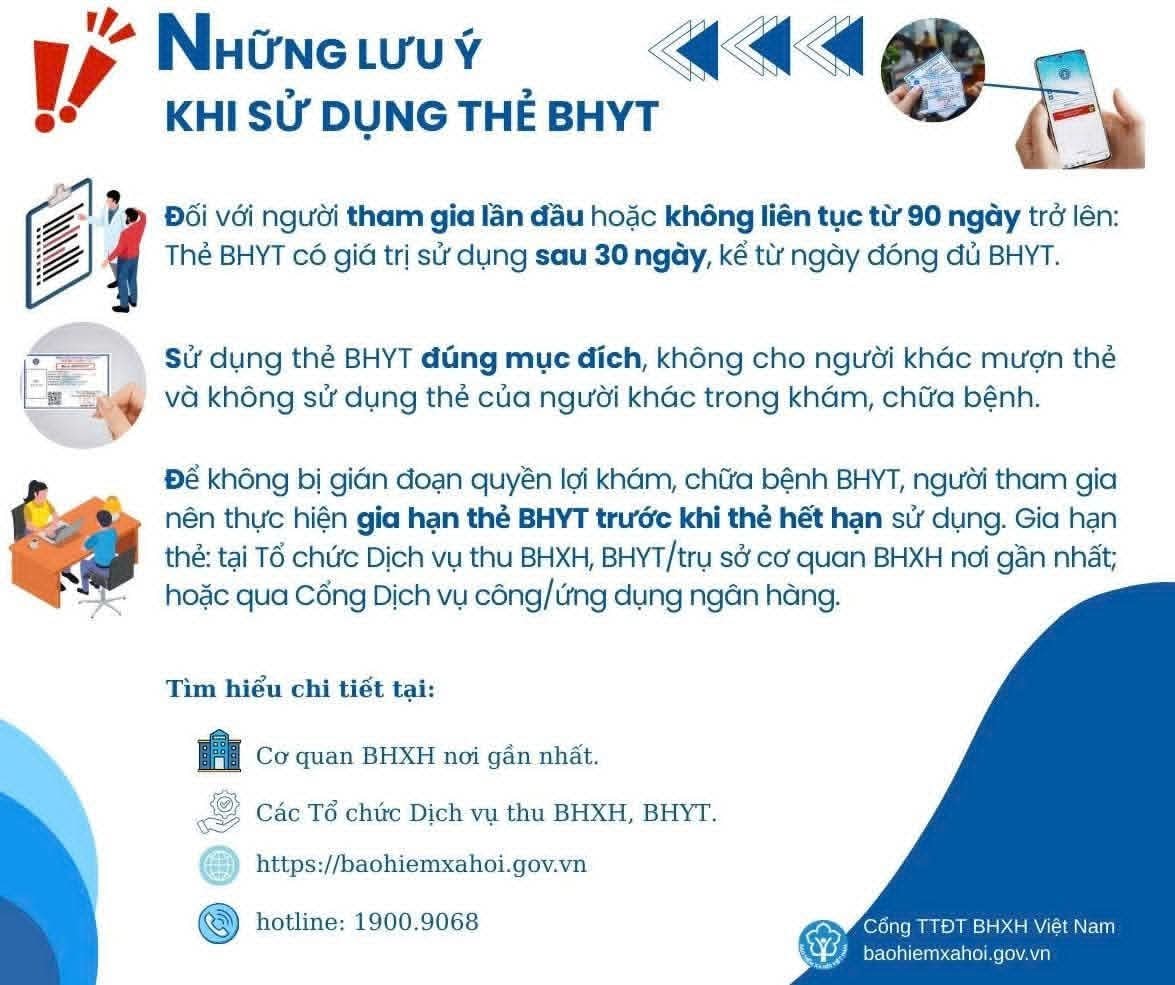 <div class="x14z9mp xat24cr x1lziwak x1vvkbs xtlvy1s x126k92a"> <div dir="auto"><span class="html-span xexx8yu xyri2b x18d9i69 x1c1uobl x1hl2dhg x16tdsg8 x1vvkbs x3nfvp2 x1j61x8r x1fcty0u xdj266r xat24cr xm2jcoa x1mpyi22 xxymvpz xlup9mm x1kky2od"><img class="xz74otr x15mokao x1ga7v0g x16uus16 xbiv7yw" src="https://static.xx.fbcdn.net/images/emoji.php/v9/t33/1/16/2705.png" alt="✅" width="16" height="16" /></span> Tham gia BHYT lần đầu/gián đoạn >90 ngày: Thẻ chỉ dùng sau 30 ngày đóng đủ.</div> </div> <div class="x14z9mp xat24cr x1lziwak x1vvkbs xtlvy1s x126k92a"> <div dir="auto"><span class="html-span xexx8yu xyri2b x18d9i69 x1c1uobl x1hl2dhg x16tdsg8 x1vvkbs x3nfvp2 x1j61x8r x1fcty0u xdj266r xat24cr xm2jcoa x1mpyi22 xxymvpz xlup9mm x1kky2od"><img class="xz74otr x15mokao x1ga7v0g x16uus16 xbiv7yw" src="https://static.xx.fbcdn.net/images/emoji.php/v9/t33/1/16/2705.png" alt="✅" width="16" height="16" /></span> Nhớ dùng đúng mục đích, đừng cho mượn thẻ BHYT nhé!</div> </div> <div class="x14z9mp xat24cr x1lziwak x1vvkbs xtlvy1s x126k92a"> <div dir="auto"><span class="html-span xexx8yu xyri2b x18d9i69 x1c1uobl x1hl2dhg x16tdsg8 x1vvkbs x3nfvp2 x1j61x8r x1fcty0u xdj266r xat24cr xm2jcoa x1mpyi22 xxymvpz xlup9mm x1kky2od"><img class="xz74otr x15mokao x1ga7v0g x16uus16 xbiv7yw" src="https://static.xx.fbcdn.net/images/emoji.php/v9/t33/1/16/2705.png" alt="✅" width="16" height="16" /></span> Đừng quên gia hạn thẻ BHYT trước khi hết hạn.</div> </div> <div class="x14z9mp xat24cr x1lziwak x1vvkbs xtlvy1s x126k92a"> <div dir="auto"><span class="html-span xexx8yu xyri2b x18d9i69 x1c1uobl x1hl2dhg x16tdsg8 x1vvkbs x3nfvp2 x1j61x8r x1fcty0u xdj266r xat24cr xm2jcoa x1mpyi22 xxymvpz xlup9mm x1kky2od"><img class="xz74otr x15mokao x1ga7v0g x16uus16 xbiv7yw" src="https://static.xx.fbcdn.net/images/emoji.php/v9/t51/1/16/1f449.png" alt="👉" width="16" height="16" /></span> Bạn đã biết những thông tin này chưa? Hãy chia sẻ để mọi người cùng nắm rõ và không bị ảnh hưởng tới các quyền lợi BHYT của bản thân nhé!</div> </div> <div class="x14z9mp xat24cr x1lziwak x1vvkbs xtlvy1s x126k92a"> <div dir="auto">Nguồn BHYT VN</div> </div>