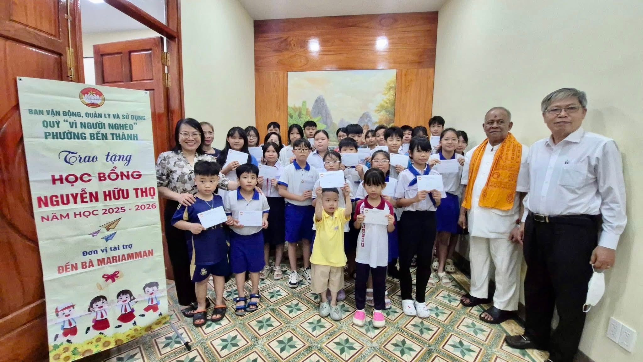 Thiết thực hưởng ứng chuỗi hoạt động “Ngày hội Thành phố văn minh – hiện đại – nghĩa tình” (đợt 2), chào mừng Đại hội đại biểu Đảng bộ TPHCM lần thứ I, nhiệm kỳ 2025-2030; chào mừng Đại hội đại biểu Mặt trận Tổ quốc Việt Nam phường lần thứ I, nhiệm kỳ 2025-2030; Ngày 28/9/2025, Ủy ban MTTQ Việt Nam phường Bến Thành phối hợp cùng Đền bà Mariamman thực hiện chương trình trao tặng học bổng Nguyễn Hữu Thọ năm học 2025-2026 (đợt 2) cho các em học sinh hộ cận nghèo trên địa bàn phường.