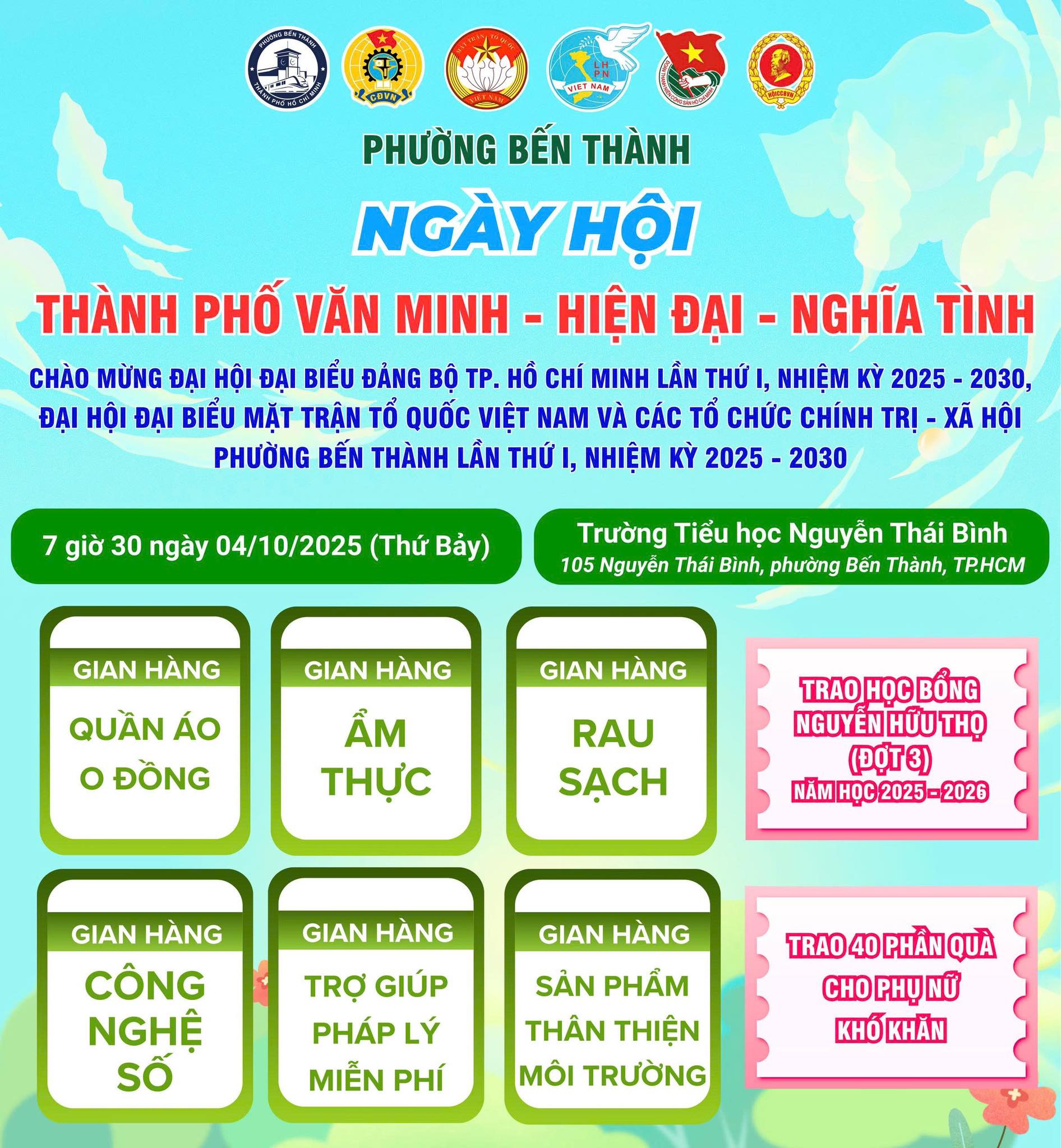 Ủy ban MTTQ Việt Nam phường Bến Thành trân trọng kính mời đoàn viên, hội viên và Nhân dân trên địa bàn phường đến tham dự Ngày hội Thành phố văn minh – hiện đại – nghĩa tình chào mừng Đại hội đại biểu Đảng bộ TPHCM, nhiệm kỳ 2025-2030; Đại hội đại biểu Mặt trận Tổ quốc và các tổ chức chính trị – xã hội phường lần thứ I, nhiệm kỳ 2025-2030.
