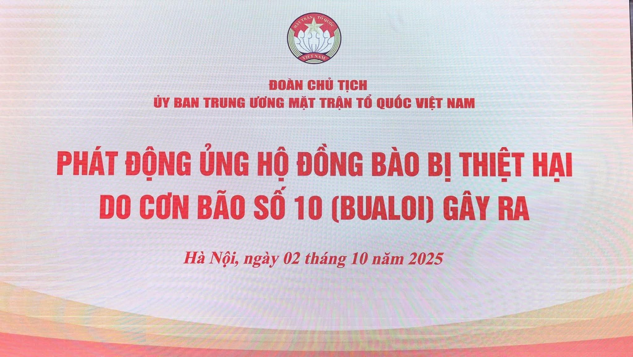 Trong những ngày qua, cơn bão số 10 và hoàn lưu sau bão đã gây thiệt hại nặng nề tới các tỉnh, thực hiện chỉ đạo của Bộ Chính trị, Ban Bí thư Trung ương Đảng, các Công điện của Thủ tướng Chính phủ và Căn cứ Nghị định số 93/2021/NĐ-CP của Chính phủ, chiều ngày 2/10, tại Hà Nội, Đoàn Chủ tịch Ủy ban Trung ương MTTQ Việt Nam tổ chức Lễ phát động kêu gọi ủng hộ đồng bào bị thiệt hại do cơn bão số 10 gây ra.