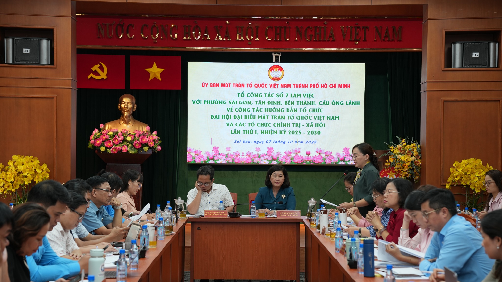 Ngày 7/10, Tổ công tác số 7 của Ủy ban Mặt trận Tổ quốc (MTTQ) Việt Nam TPHCM do đồng chí Phạm Minh Tuấn, Phó Chủ tịch Ủy ban MTTQ Việt Nam thành phố làm trưởng đoàn đã có buổi làm việc với 4 phường: Sài Gòn, Tân Định, Bến Thành, Cầu Ông Lãnh về công tác hướng dẫn tổ chức Đại hội đại biểu Mặt trận Tổ quốc Việt Nam và các tổ chức chính trị – xã hội lần thứ I, nhiệm kỳ 2025 – 2030.