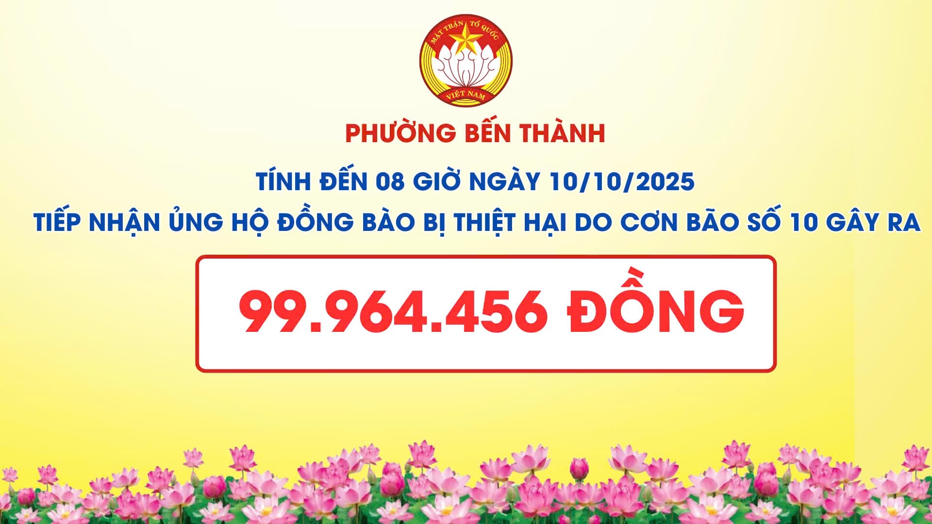 Tính đến 11 giờ ngày 10/10/2025, Ủy ban MTTQ phường Bến Thành đã tiếp nhận gần 100 triệu đồng bằng tiền mặt và chuyển khoản vào Quỹ cứu trợ của phường từ cán bộ, đảng viên, các doanh nghiệp, tổ chức, cá nhân và Nhân dân trên địa bàn phường ủng hộ đồng bào miền Bắc bị ảnh hưởng do bão số 10 (Bualoi) gây ra. Những nghĩa cử cao đẹp này thể hiện tinh thần “tương thân tương ái”, “lá lành đùm lá rách”, góp phần lan tỏa truyền thống đoàn kết, nhân ái của dân tộc.