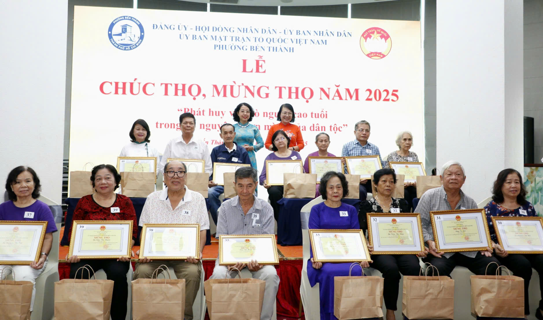 Nhân dịp này, phường Bến Thành đã trao Giấy và quà Mừng thọ 847 cụ cao niên trên toàn phường từ tuổi 70, 75 và 80 tuổi.