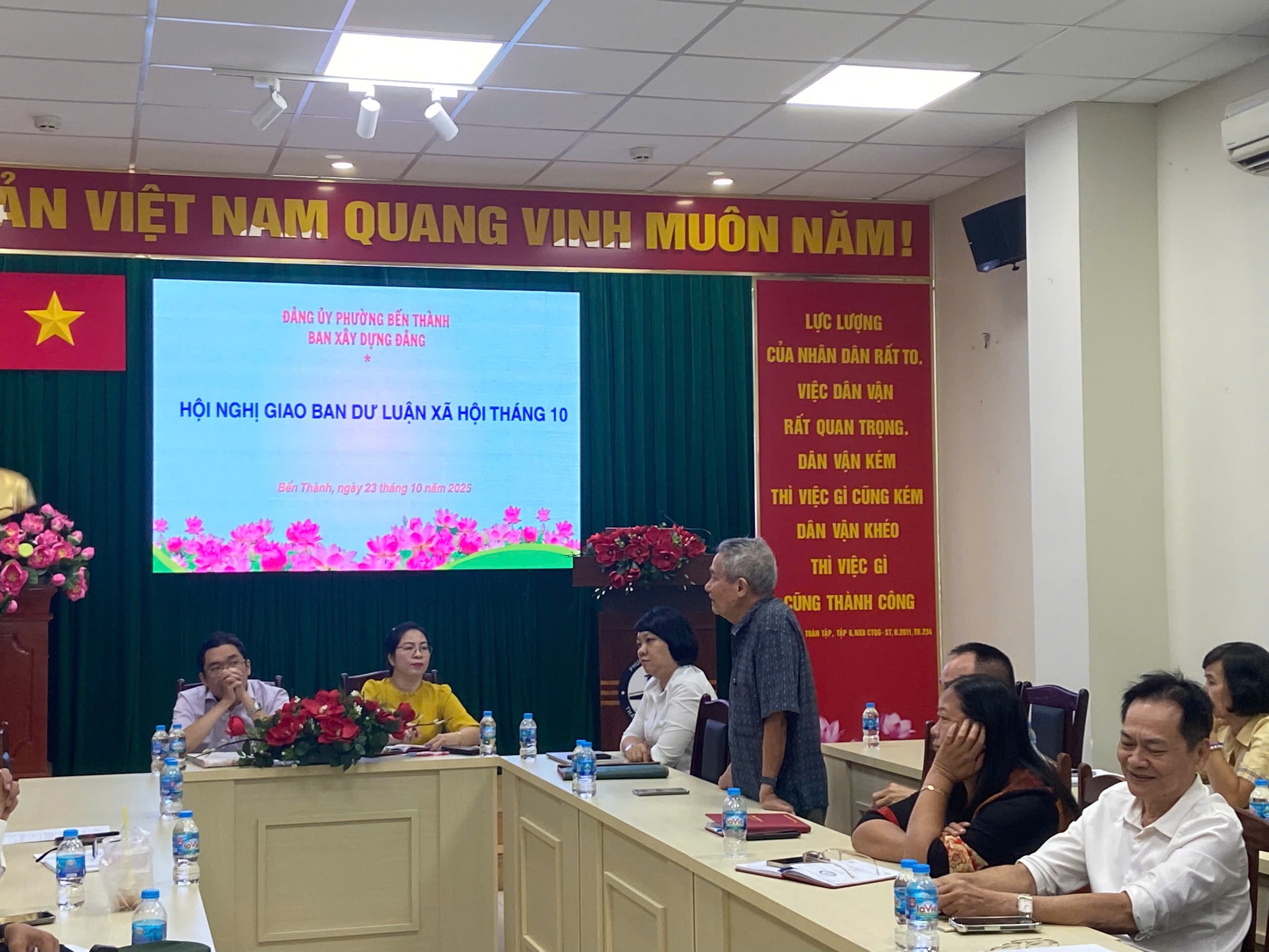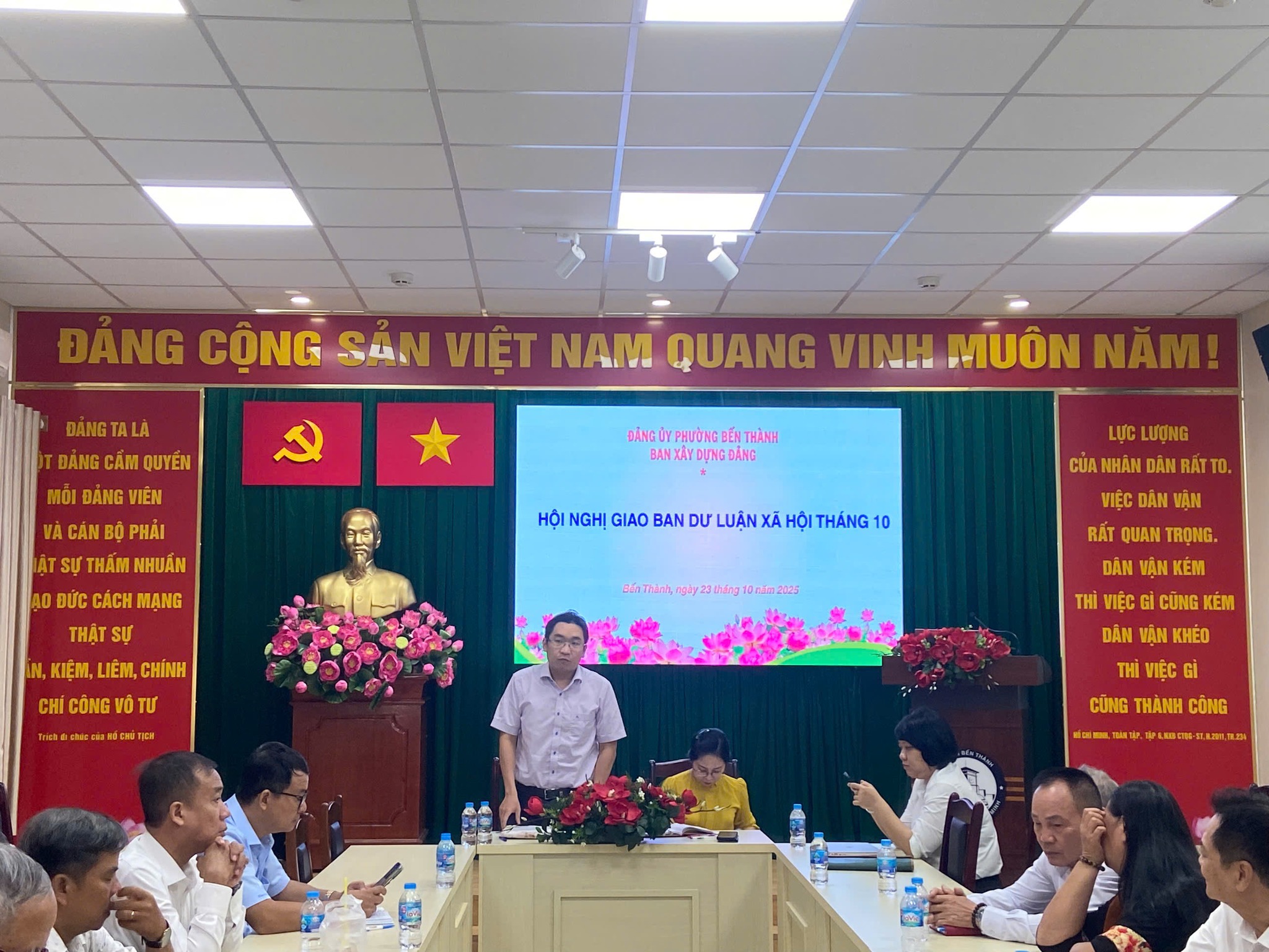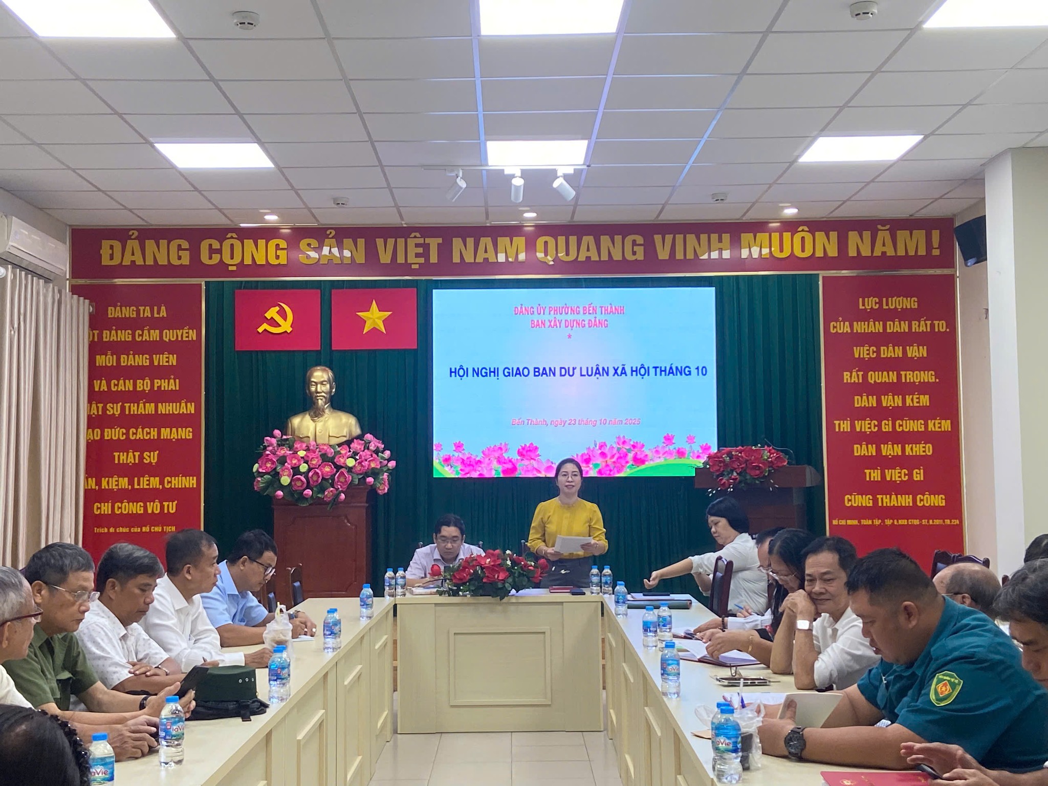 Ngày 23/10/2025, Ban Xây dựng Đảng phường Bến Thành tổ chức Hội nghị giao ban dư luận xã hội tháng 10. Tham dự hội nghị có các đồng chí: Trần Đỗ Nam Long – Ủy viên Ban Thường vụ, Trưởng Ban Xây dựng Đảng; Bùi Thị Thúy Hiền – Phó Trưởng Ban Xây dựng Đảng; Đại diện Lãnh đạo Văn phòng HĐND – UBND, Phòng Kinh tế, Hạ tầng và Đô thị; Ban Chỉ huy Công an, Quân sự phường; Ủy ban Mặt trận Tổ quốc Việt Nam phường; bí thư chi bộ 27 khu phố; cộng tác viên dư luận xã hội phường, các trường Mầm non, Tiểu học, trên địa bàn.