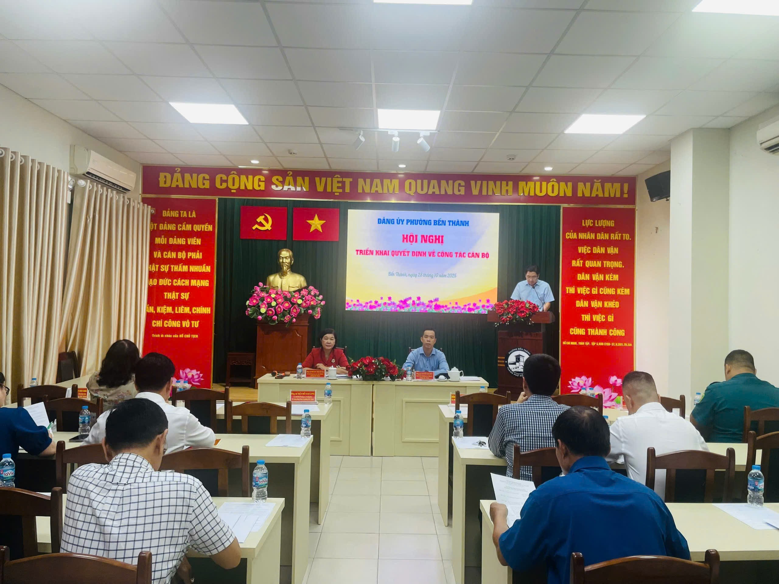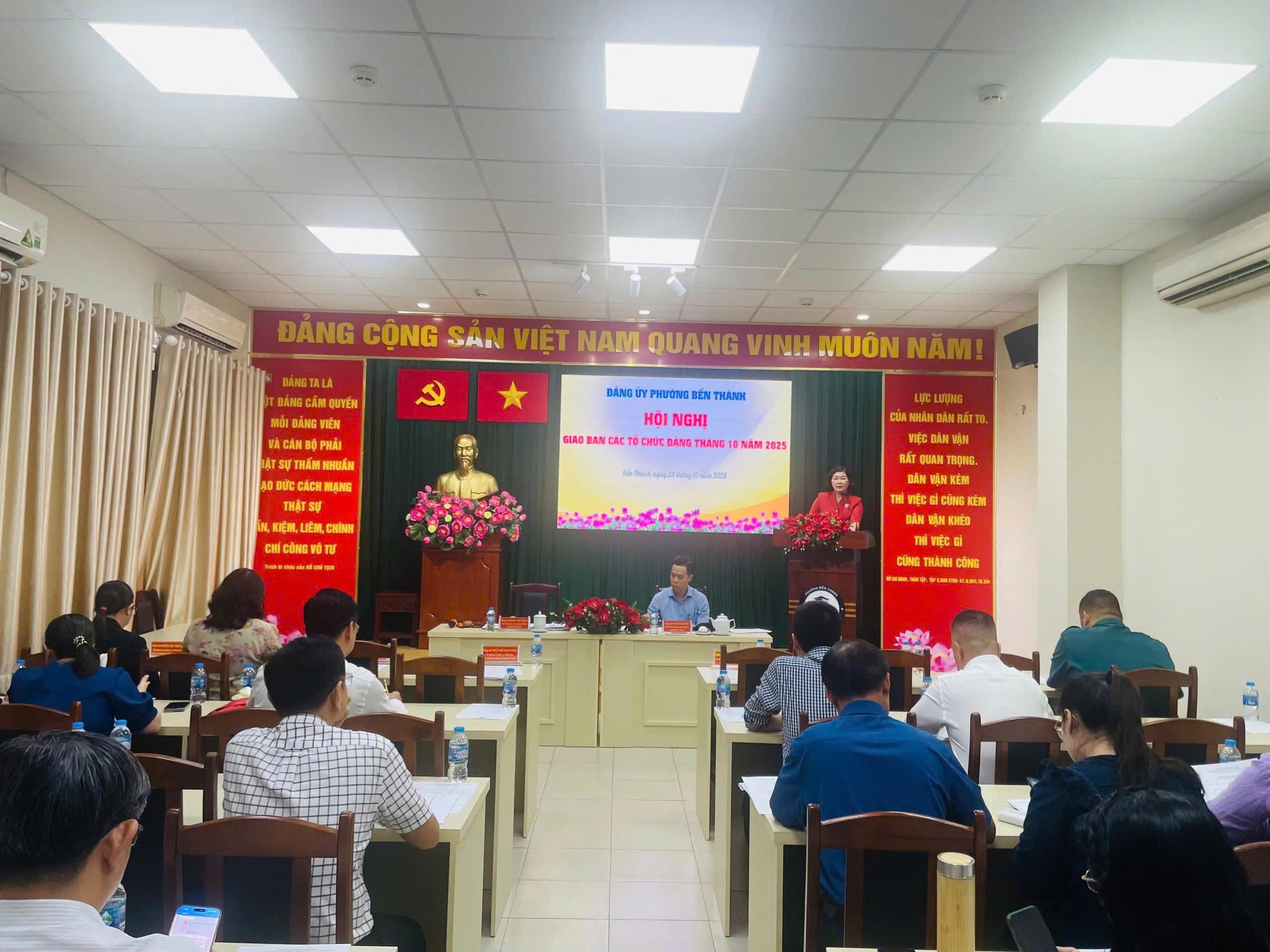Ngày 28 tháng 10 năm 2025, Đảng ủy phường Bến Thành tổ chức Hội nghị giao ban các tổ chức đảng tháng 10 năm 2025 vào hai buổi sáng và chiều. Đồng chí Hoàng Thị Tố Nga – Bí thư Đảng ủy, Chủ tịch Hội đồng nhân dân phường chủ trì hội nghị. Tham dự hội nghị có các đồng chí trong Ban Thường vụ Đảng ủy phường; buổi sáng có đại diện cấp ủy 27 chi bộ khu phố; buổi chiều có đại diện cấp ủy các tổ chức đảng trực thuộc còn lại.
