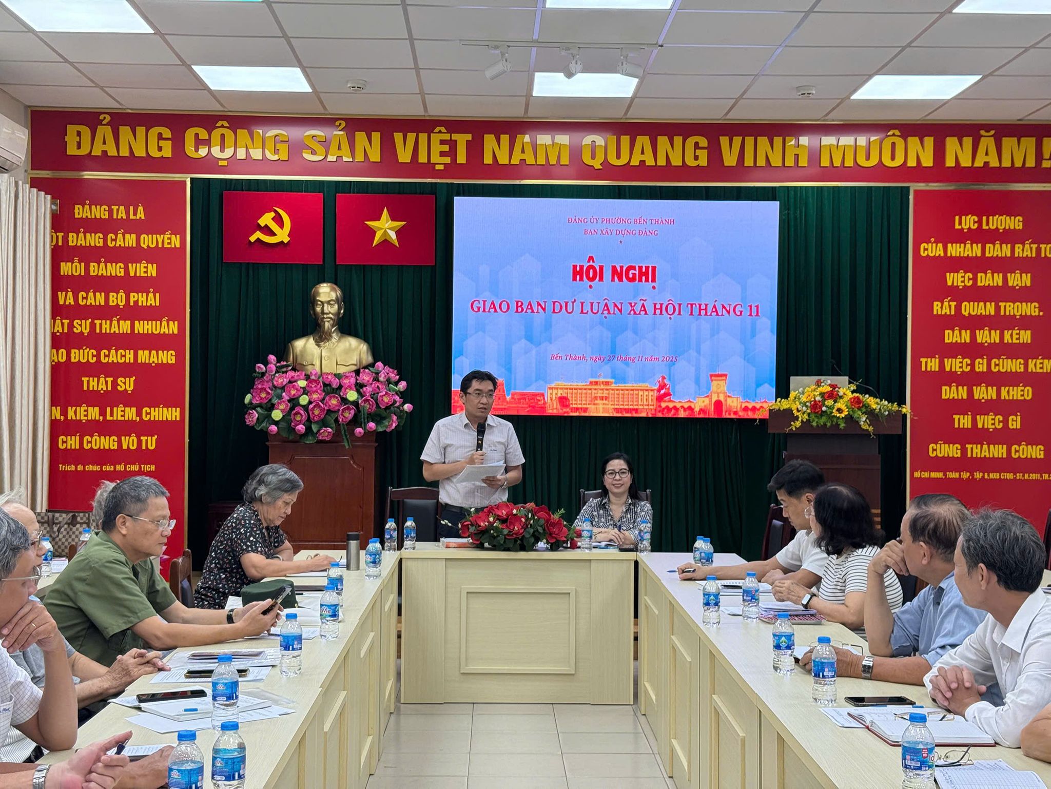 Ngày 27/11//2025, Ban Xây dựng Đảng phường Bến Thành tổ chức Hội nghị giao ban dư luận xã hội tháng 11. Tham dự hội nghị có các đồng chí: Trần Đỗ Nam Long – Ủy viên Ban Thường vụ, Trưởng Ban Xây dựng Đảng; Bùi Thị Thúy Hiền – Phó Trưởng Ban Xây dựng Đảng; Đại diện lãnh đạo Phòng Văn hóa – Xã hội; Phòng Kinh tế, Hạ tầng và Đô thị; Công an phường, Ban Chỉ huy Quân sự phường; Ban Thường trực Ủy ban MTTQ Việt Nam phường; bí thư chi bộ 27 khu phố; Cộng tác viên dư luận xã hội phường; Bí thư Chi bộ Trường Mầm non Tuổi Hồng, Bí thư Chi bộ Trường Tiểu học: Nguyễn Thái Bình; Nguyễn Thái Học, Bí thư Chi bộ Trường THCS Đồng Khởi, Bí thư Chi bộ Trường THPT Bùi Thị Xuân.