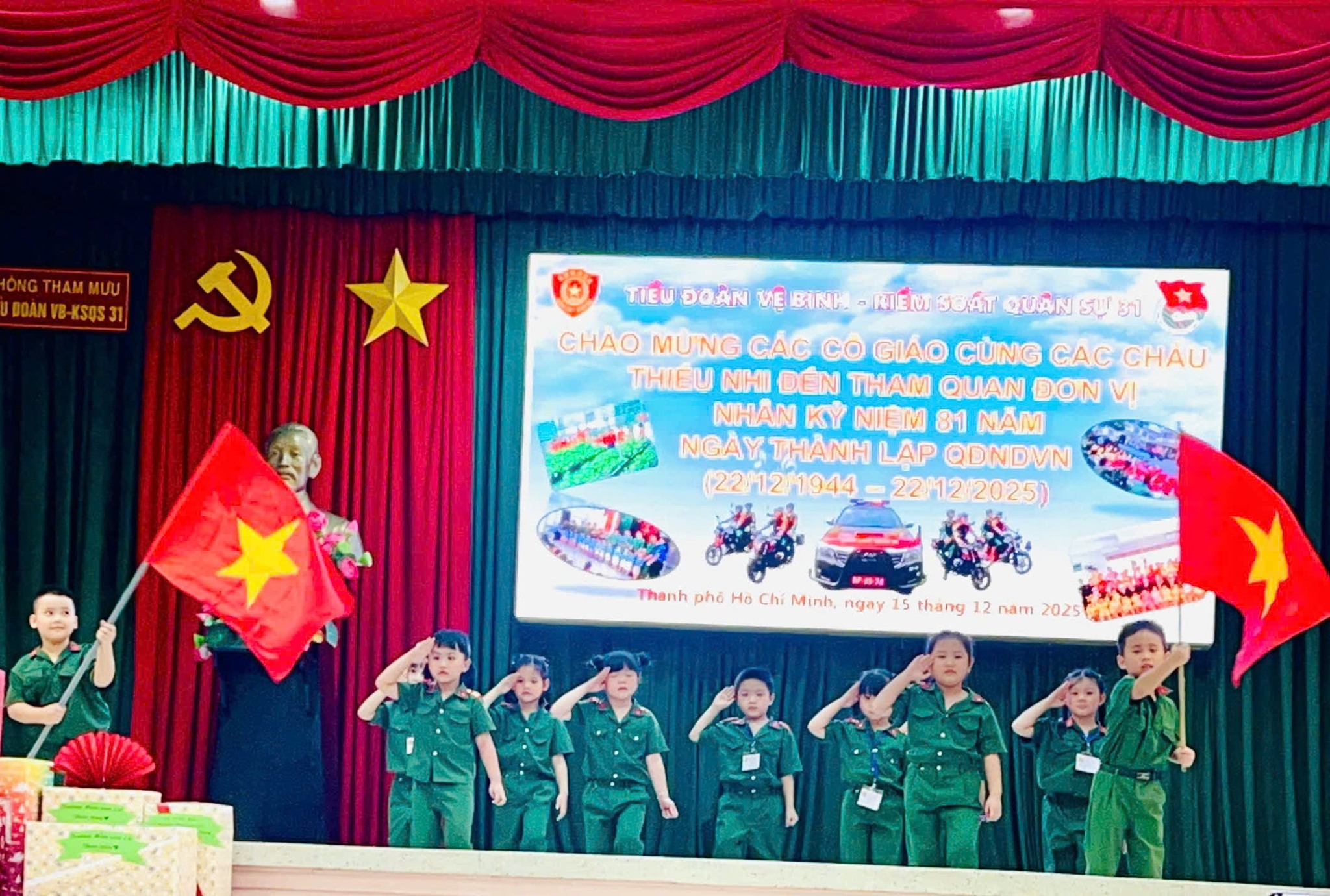 Hòa trong không khí phấn khởi chào mừng Ngày thành lập Quân đội nhân dân Việt Nam (22/12/1944 – 22/12/2025), Trường Mầm non Tuổi Hồng tổ chức cho các bé 5 – 6 tuổi (khối Lá) tham quan tại Tiểu đoàn Vệ binh – Kiểm soát Quân sự 31.