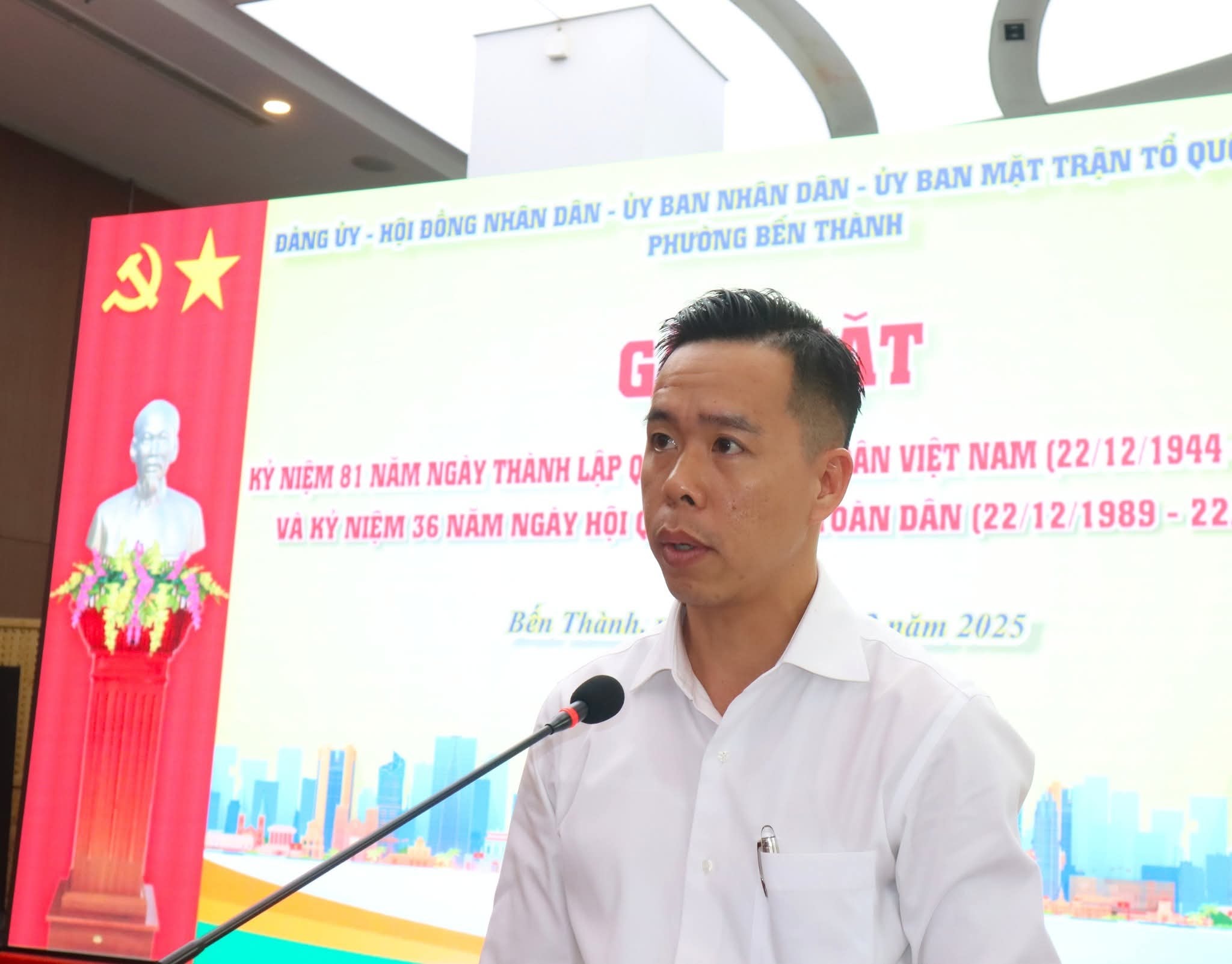 Phát biểu tại buổi gặp mặt, đồng chí Nguyễn Kim Đức, Phó Bí thư Thường trực Đảng ủy phường Bến Thành bày tỏ lòng tri ân sâu sắc đến cán bộ, chiến sĩ quân đội nhân dân Việt Nam qua các thời kỳ đã cùng với đồng bào, đồng chí chiến đấu hy sinh vì độc lập tự do của Tổ quốc, vì hạnh phúc của Nhân dân, vì sự trường tồn của dân tộc.