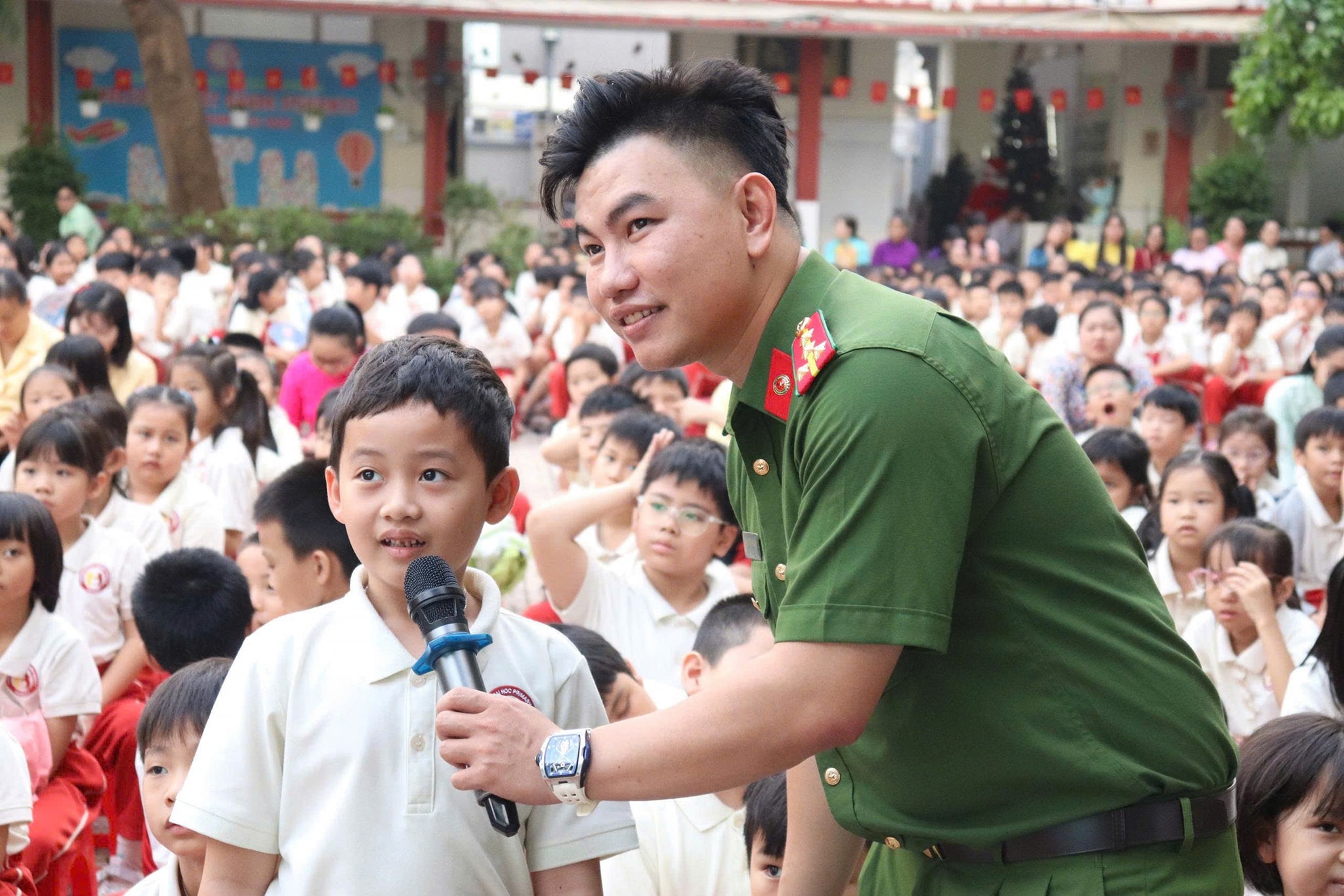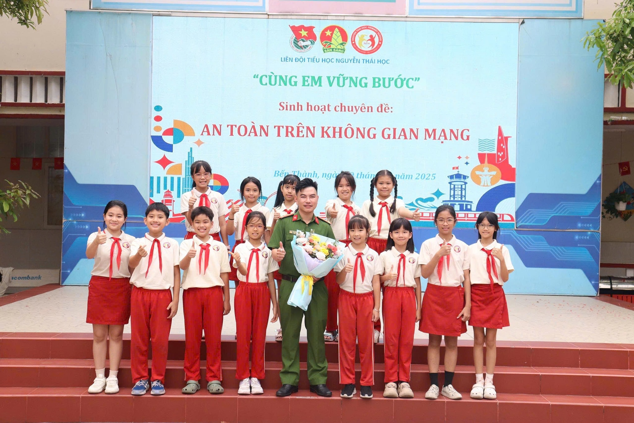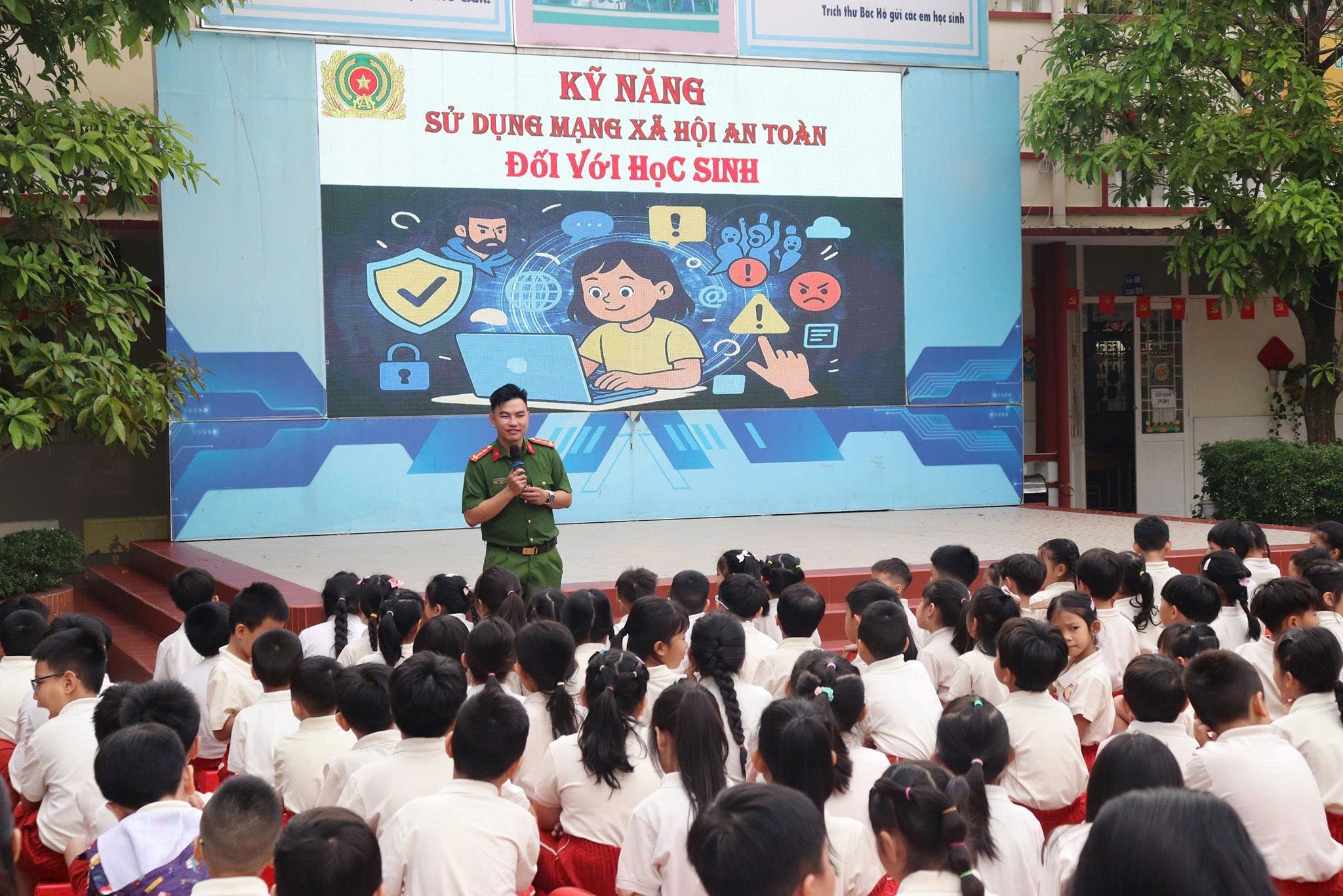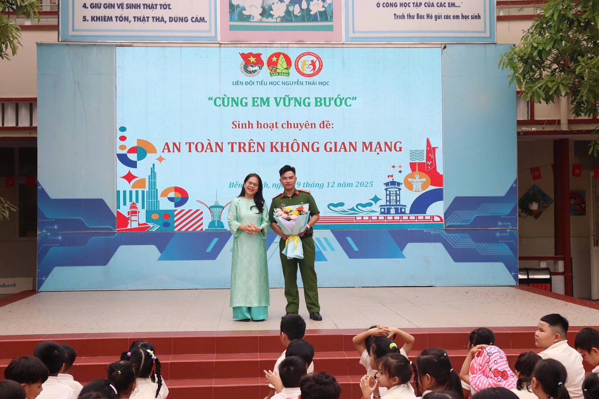 Trong buổi sáng chào cờ thứ hai đầu tuần (29/12/2025), nhằm trang bị cho học sinh những kiến thức và kỹ năng cần thiết khi tham gia môi trường internet, Trường Tiểu học Nguyễn Thái Học phối hợp Ban Công tác Thanh niên – Công an TP.Hồ Chí Minh tổ chức chuyên đề “An toàn trên không gian mạng” cho học sinh toàn trường.