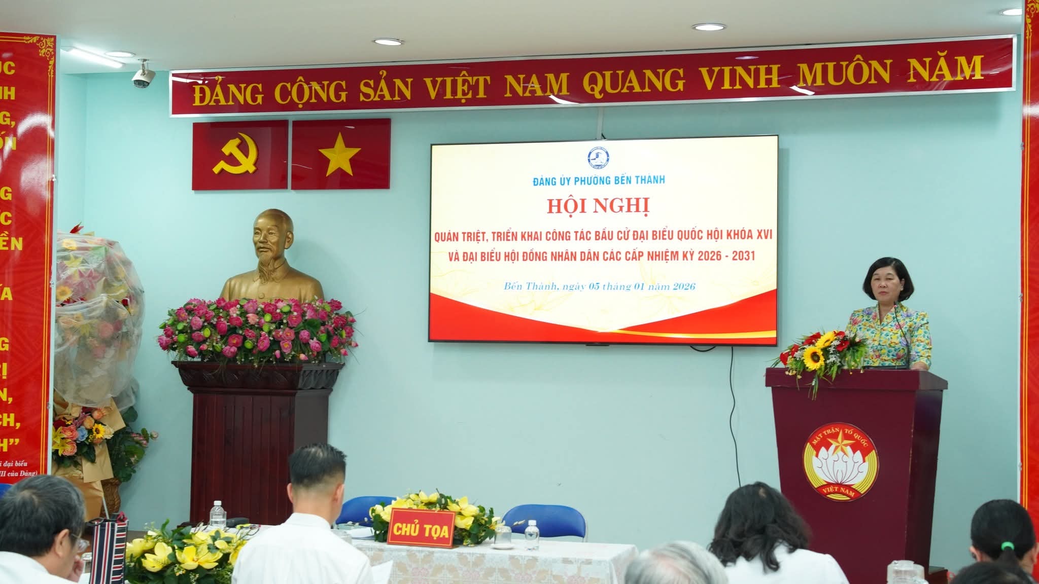 Ngày 5/1, Đảng ủy phường Bến Thành tổ chức hội nghị quán triệt, triển khai công tác bầu cử đại biểu Quốc Hội khóa XVI và đại biểu HĐND các cấp nhiệm kỳ 2026 – 2031. Đồng chí Hoàng Thị Tố Nga, Bí thư Đảng ủy, Chủ tịch HĐND phường chủ trì hội nghị.