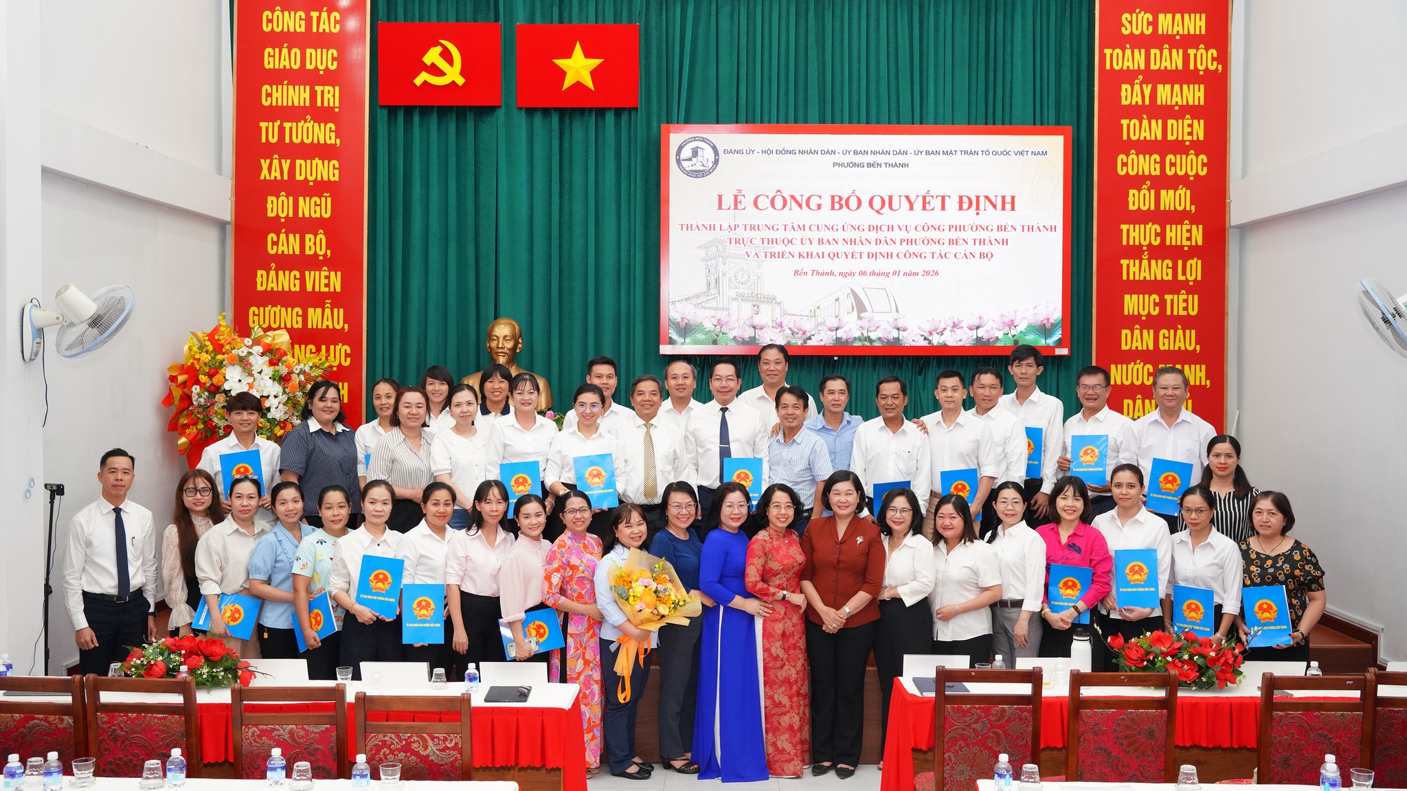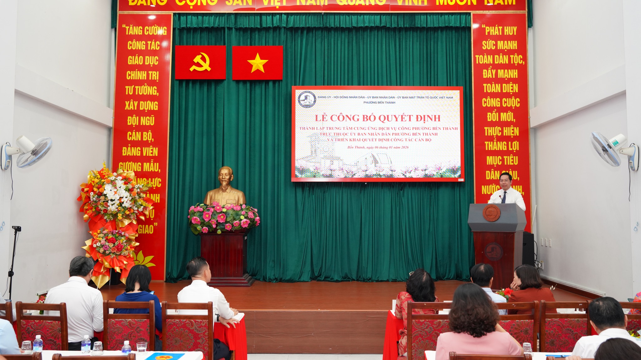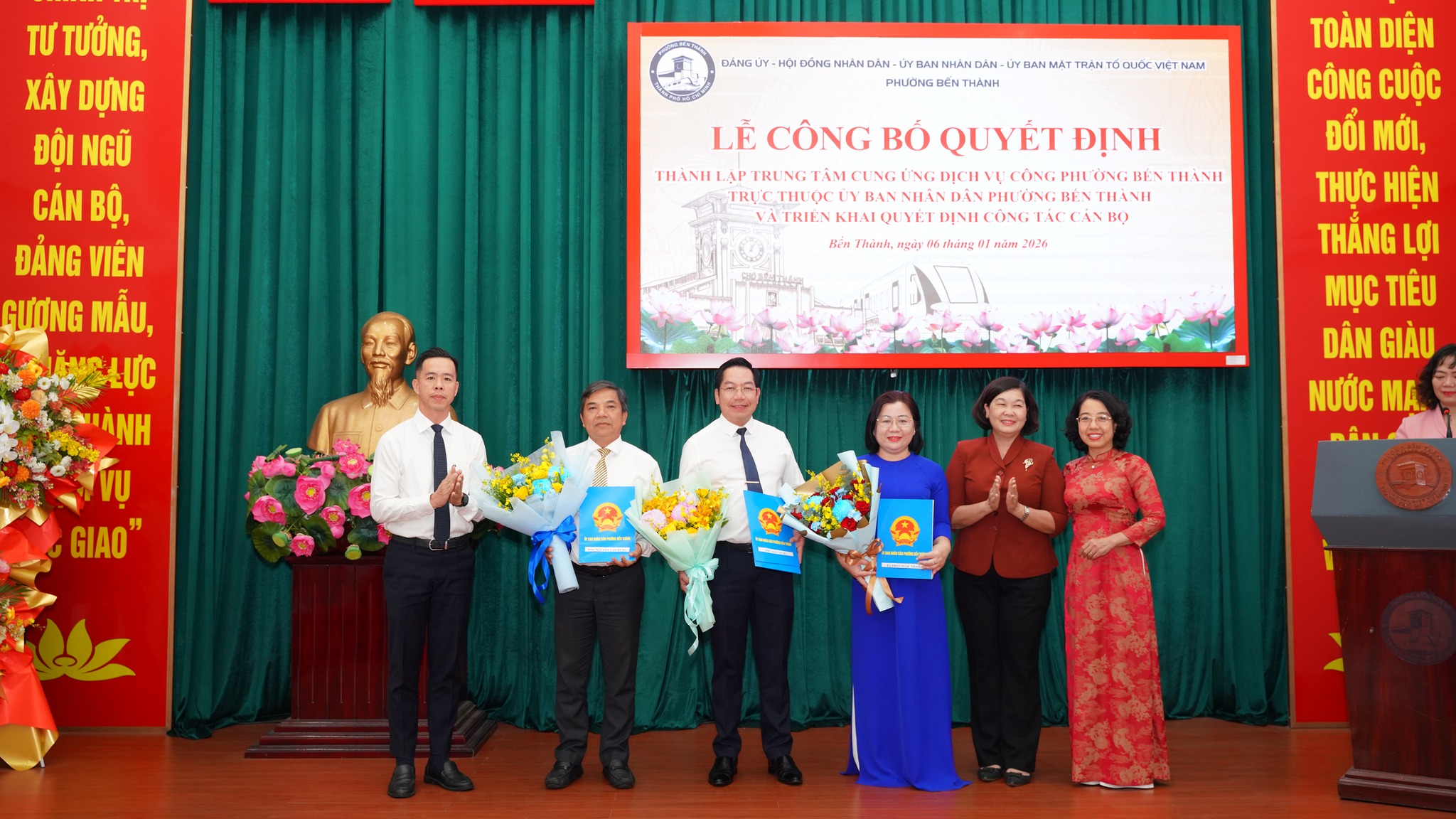 Chiều 6/1, Đảng ủy – HĐND – UBND – Ủy ban MTTQ Việt Nam phường Bến Thành tổ chức lễ công bố Quyết định thành lập Trung tâm cung ứng dịch vụ công phường Bến Thành trực thuộc UBND phường và triển khai quyết định công tác cán bộ.