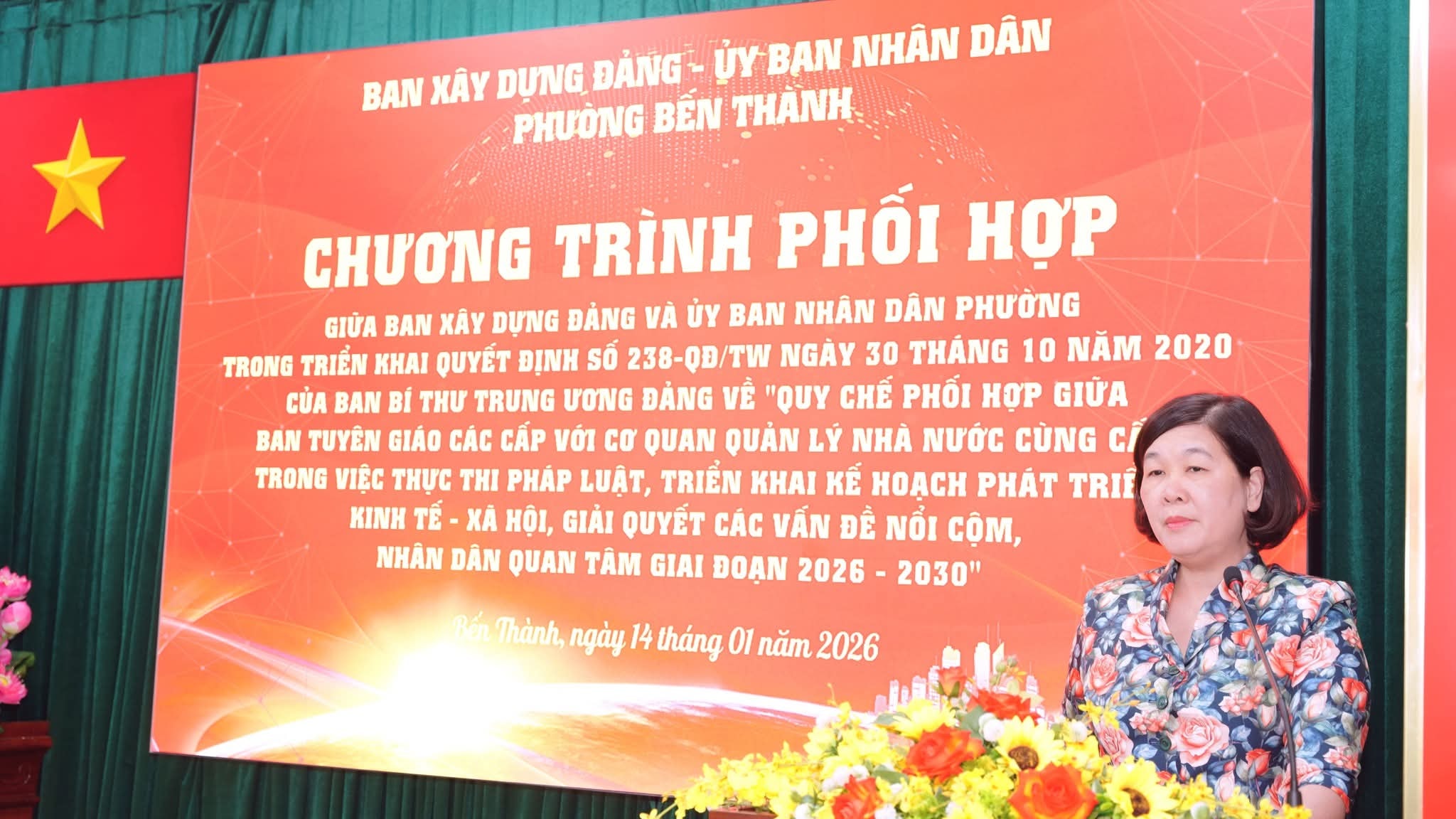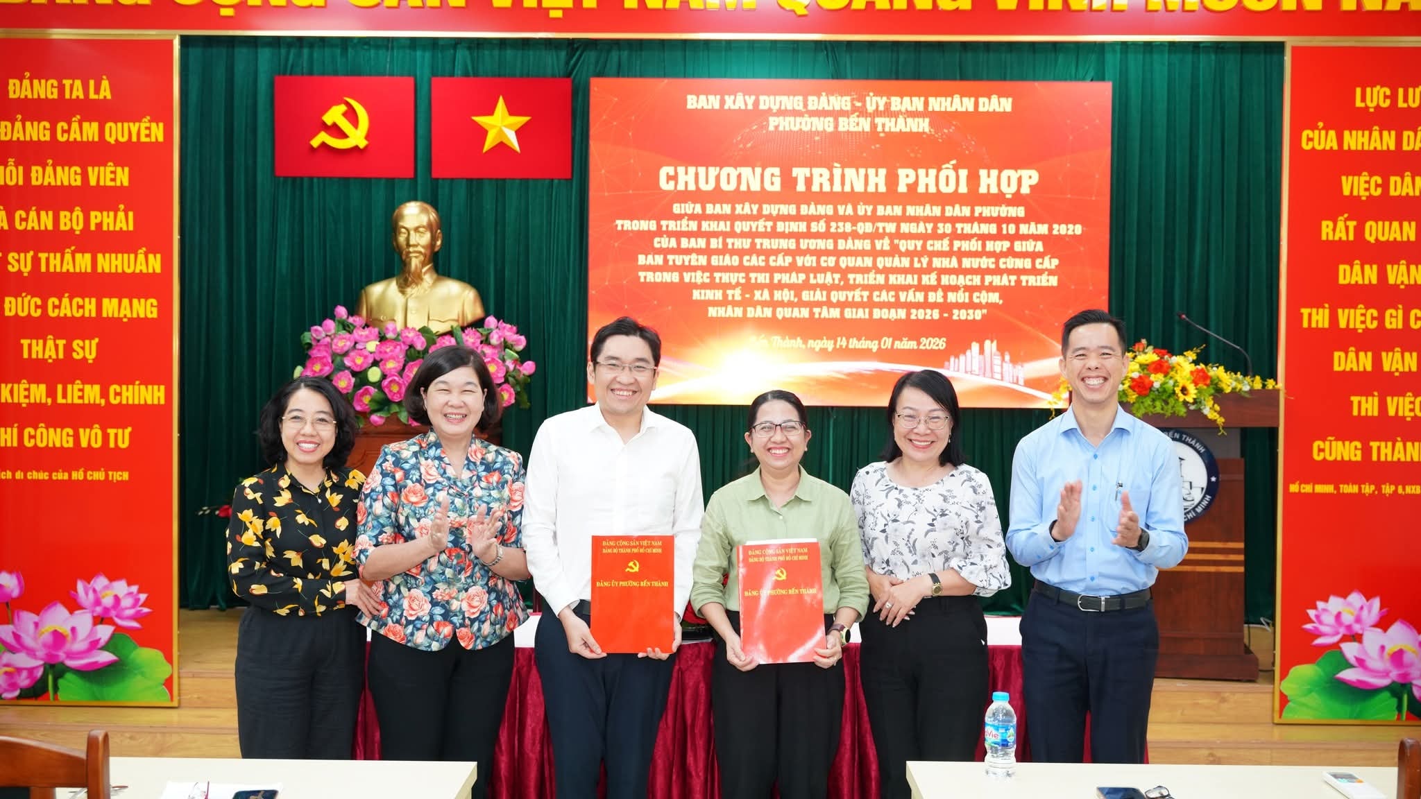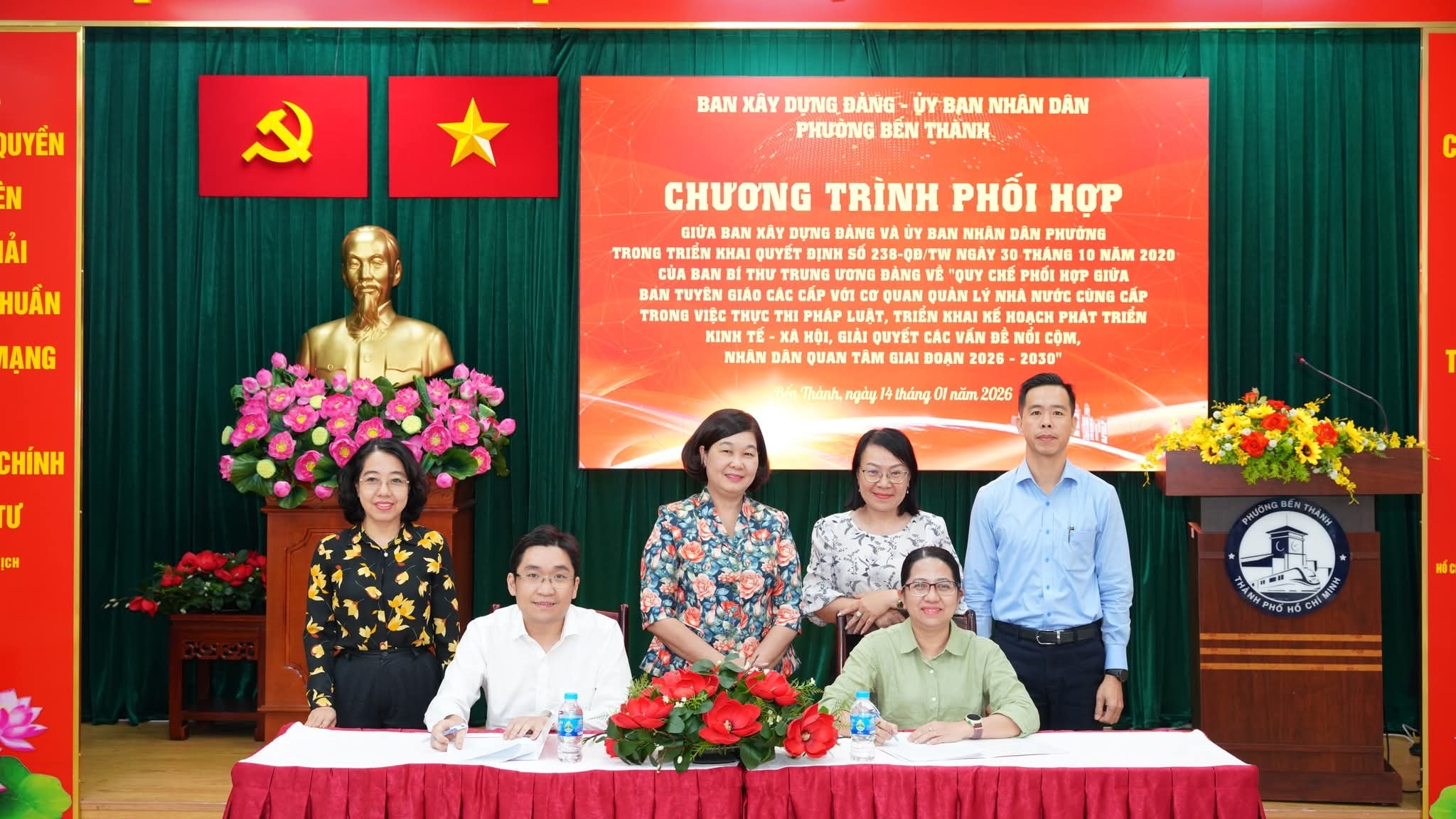 Chiều 14/1, Ban Xây dựng Đảng và UBND phường Bến Thành tổ chức ký kết Chương trình phối hợp trong triển khai Quyết định số 238-QĐ/TW ngày 30/10/2020 của Ban Bí thư Trung ương Đảng về “Quy chế phối hợp giữa Ban Tuyên giáo các cấp với cơ quan quản lý nhà nước cùng cấp trong việc thực thi pháp luật, triển khai kế hoạch phát triển kinh tế – xã hội, giải quyết các vấn đề nổi cộm, Nhân dân quan tâm giai đoạn 2026 – 2030”.