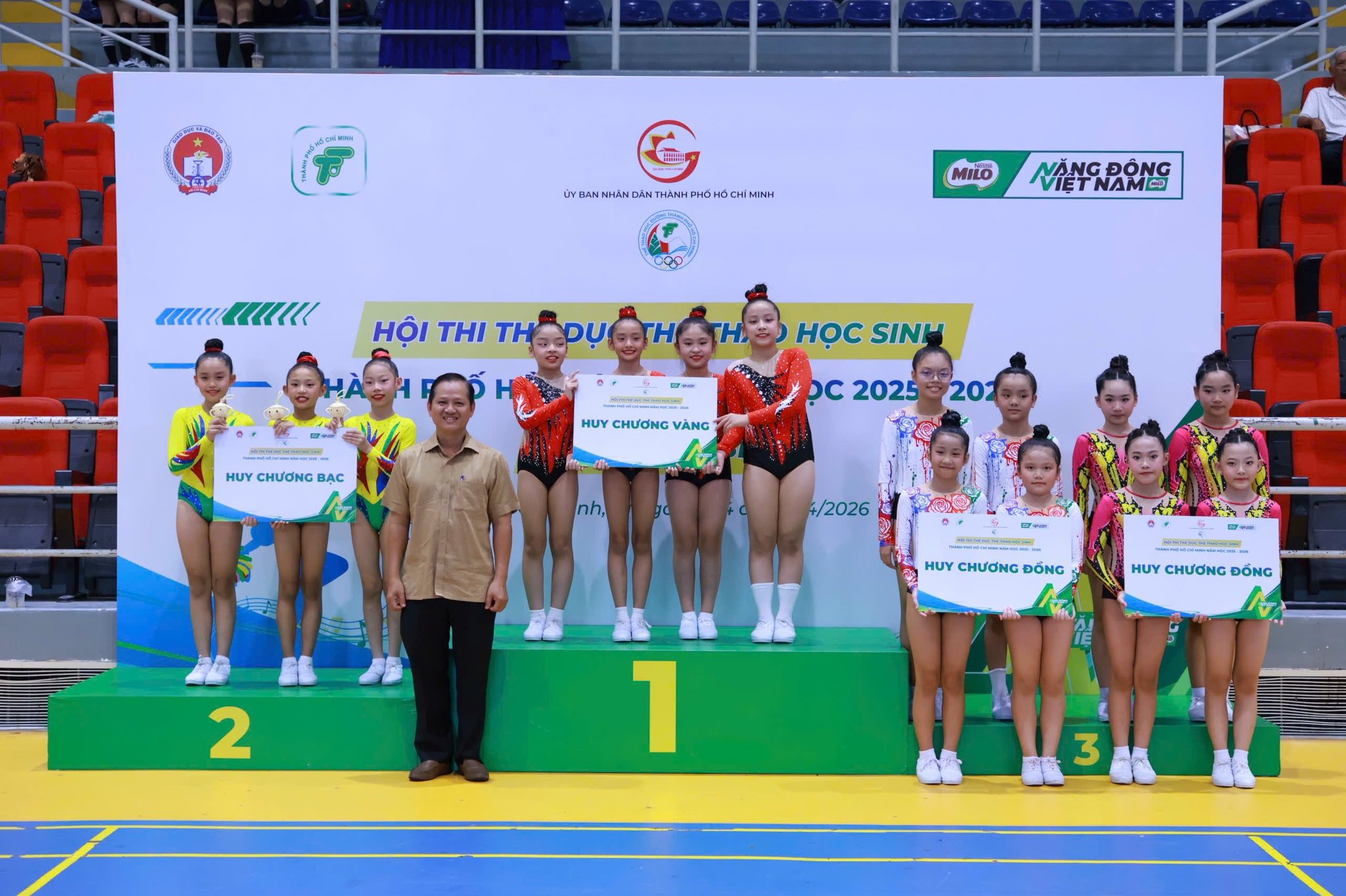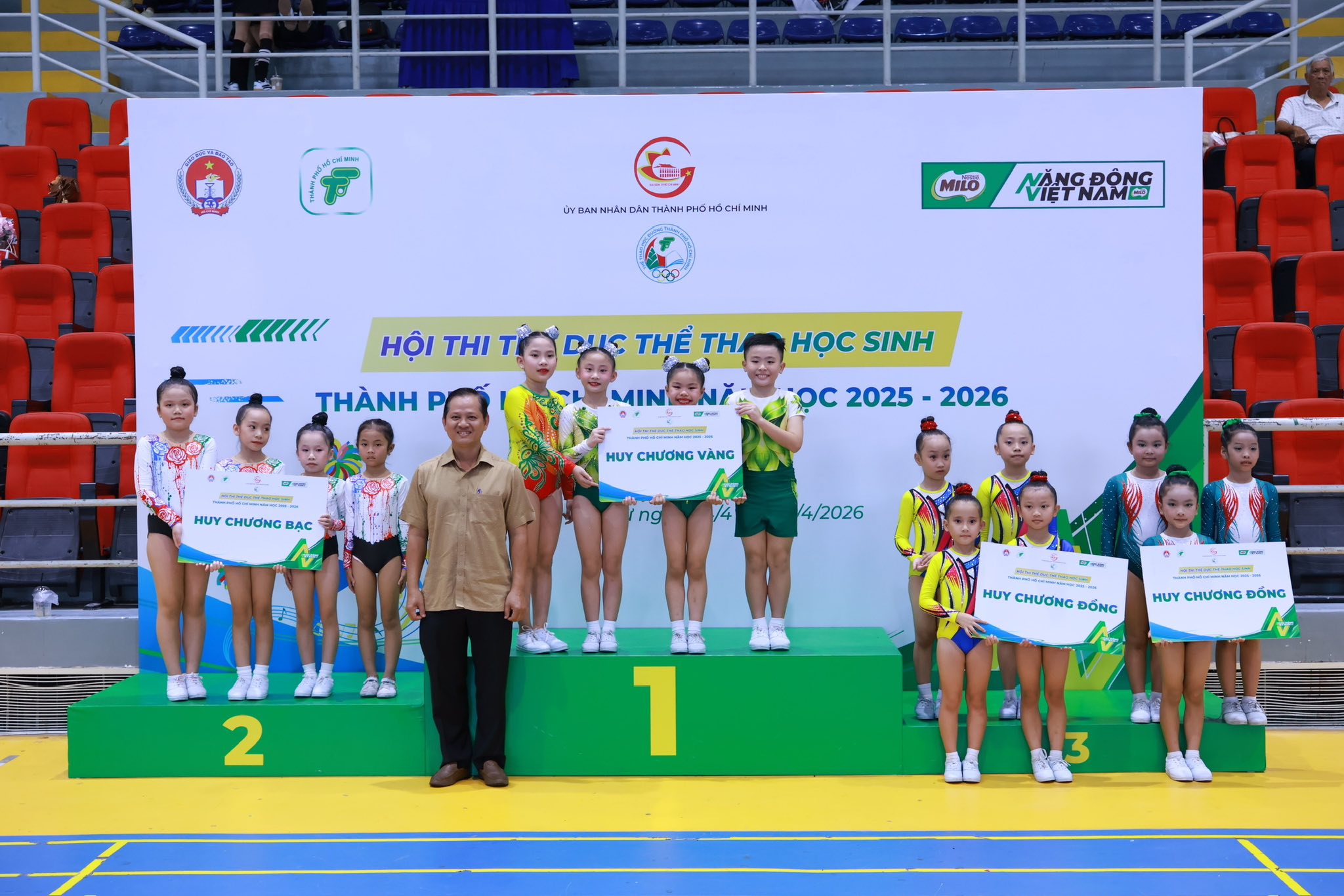 Xin chúc mừng các em học sinh đội Aerobic trường Tiểu học Khai Minh phường Bến Thành đã nỗ lực thi đấu, thể hiện sự chuẩn bị kỹ lưỡng và hoàn thành xuất sắc phần thi của mình. Kết quả xuất sắc giành 2 Huy chương Vàng ở cả hai nội dung Tự chọn 1-3 và Tự chọn 4-5 tại Hội thi Thể dục Thể thao Thành phố Hồ Chí Minh năm học 2025-2026.