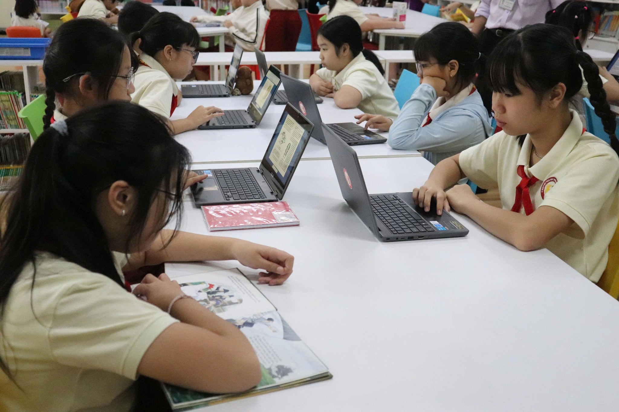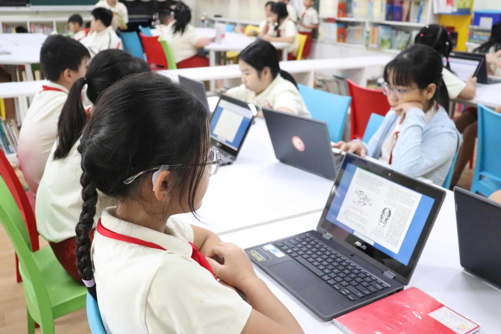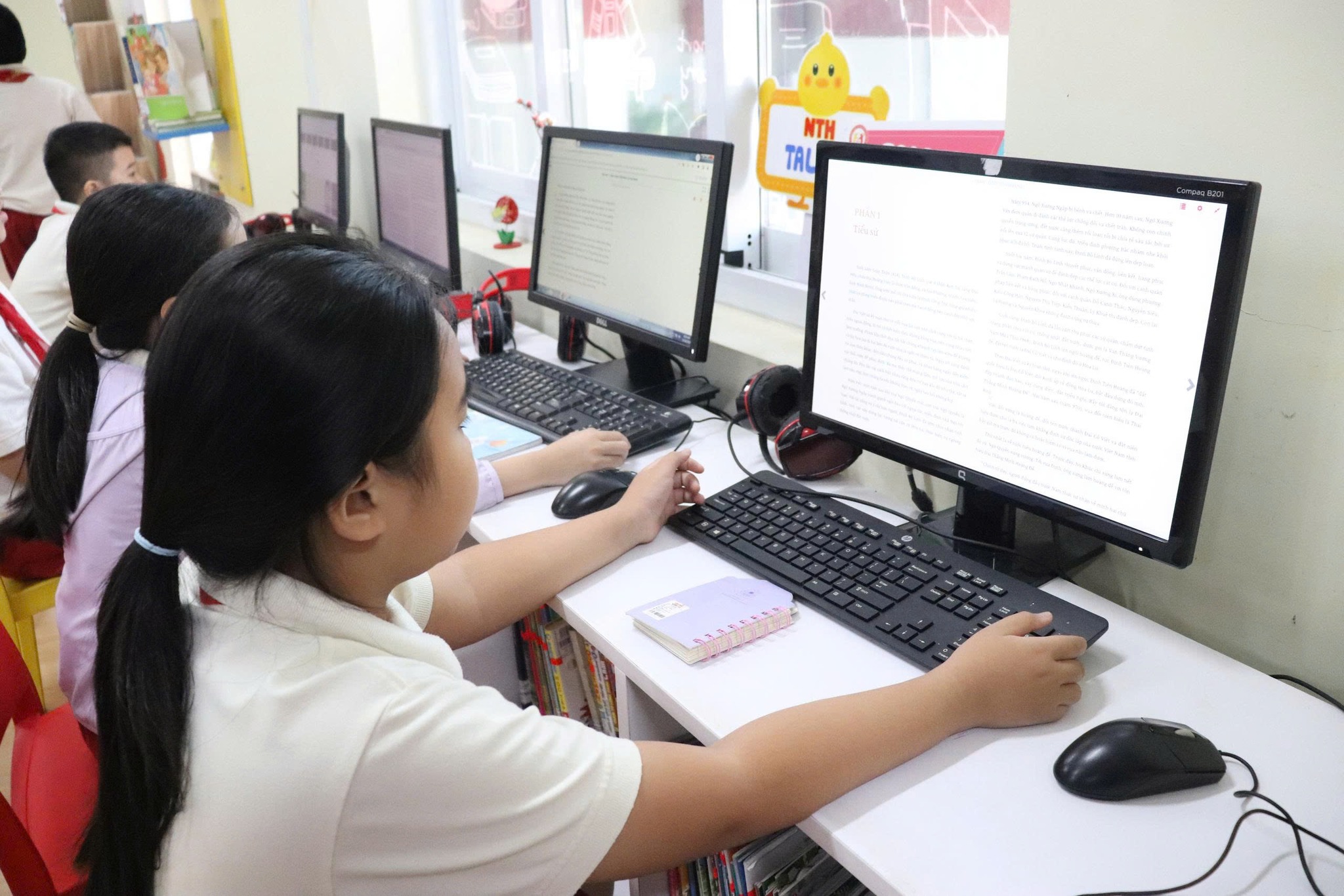 Song song với đổi mới quản lý, Trường Tiểu học Nguyễn Thái Học cũng chú trọng chuyển đổi số trong hoạt động thư viện, hướng tới mục tiêu xây dựng “Thư viện số thông minh”. Thay vì chỉ dừng lại ở việc mượn và trả sách truyền thống, thư viện nhà trường đã tích hợp hệ thống mã QR vào từng đầu sách, truyện, tài liệu. Giáo viên và học sinh chỉ cần quét mã QR là có thể truy cập ngay nội dung sách trực tuyến, đọc mọi lúc, mọi nơi.