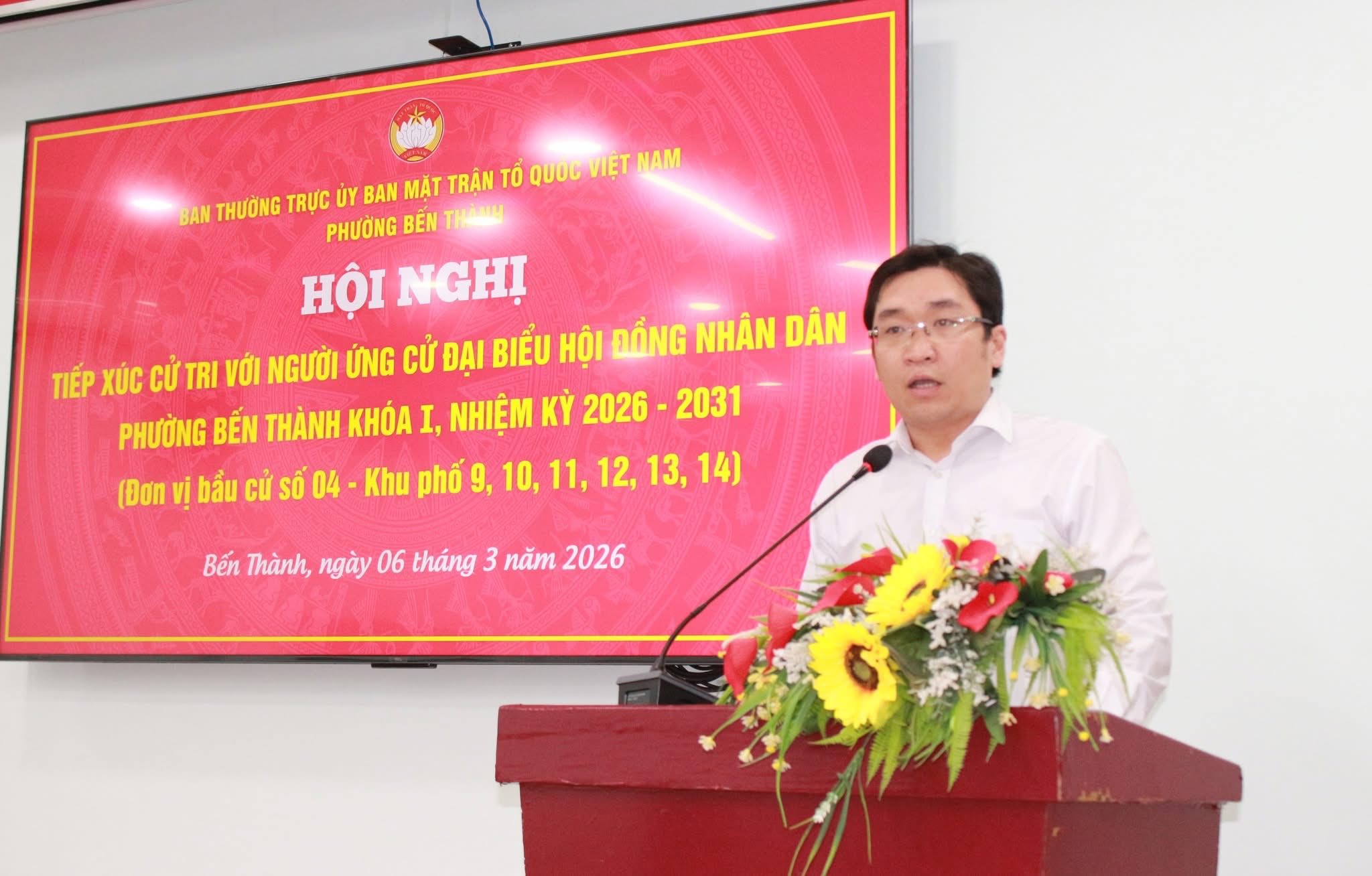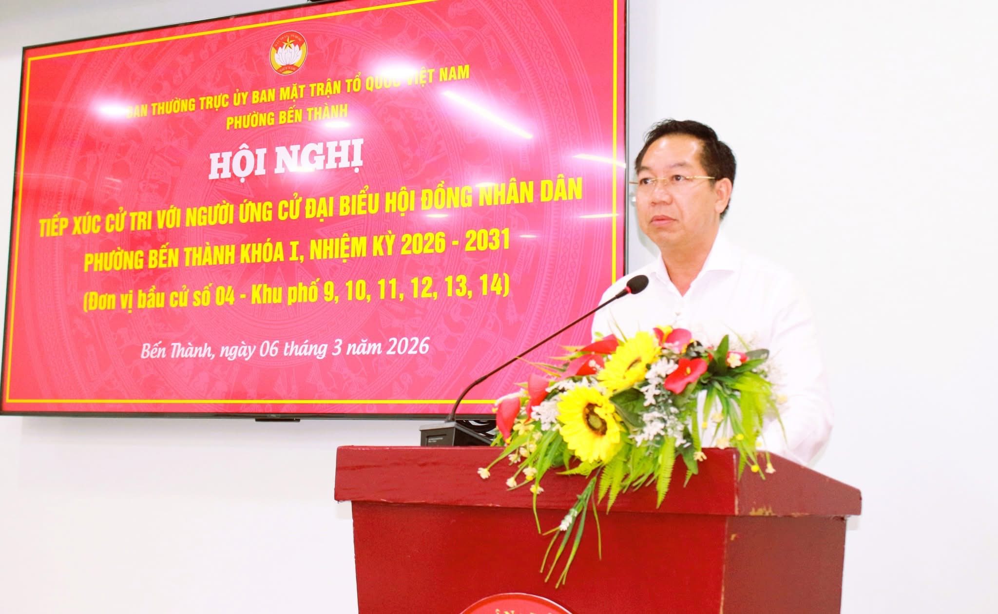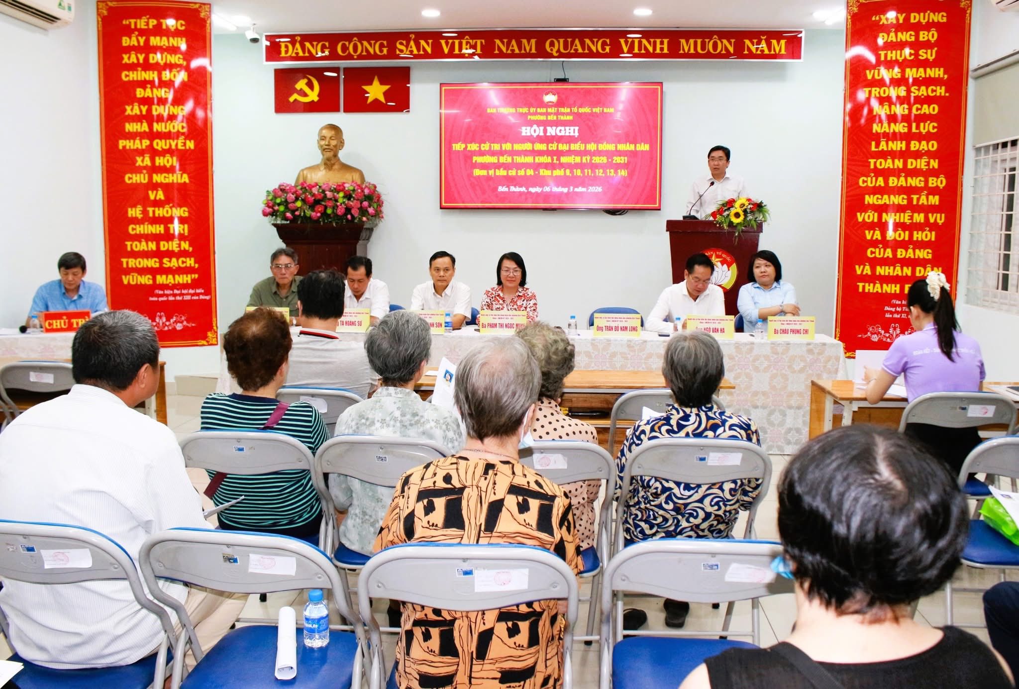 Tối 6/3, tại trụ sở Ủy ban MTTQ phường Bến Thành, Ban Thường trực Ủy ban MTTQ Việt Nam phường Bến Thành tổ chức hội nghị tiếp xúc cử tri với người ứng cử đại biểu Hội đồng nhân dân (HĐND) phường Bến Thành khóa I, nhiệm kỳ 2026 – 2031 (đơn vị bầu cử số 4) với cử tri Khu phố 9.