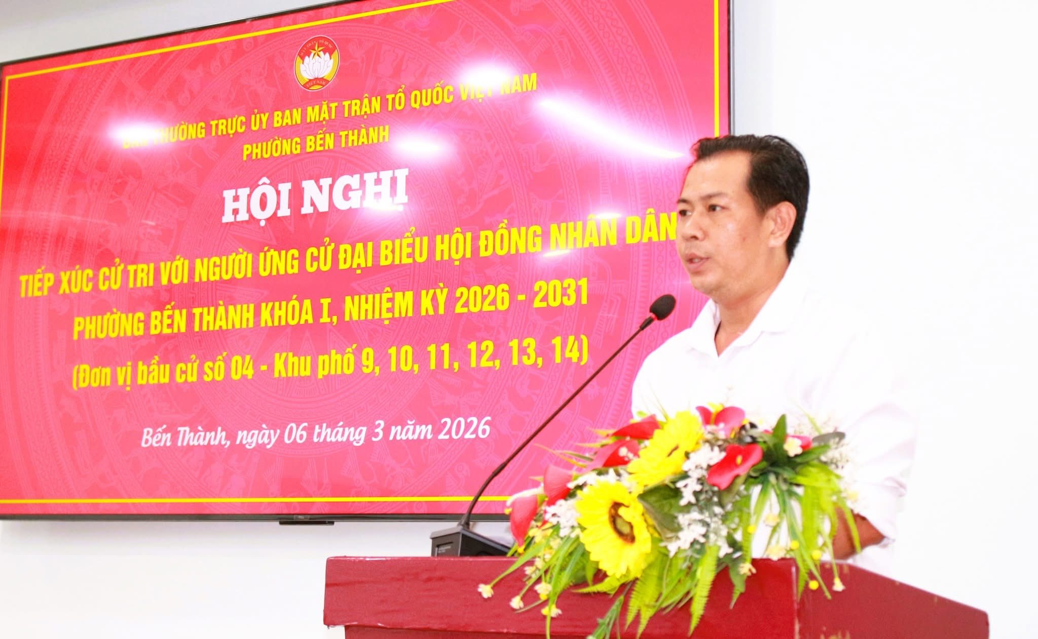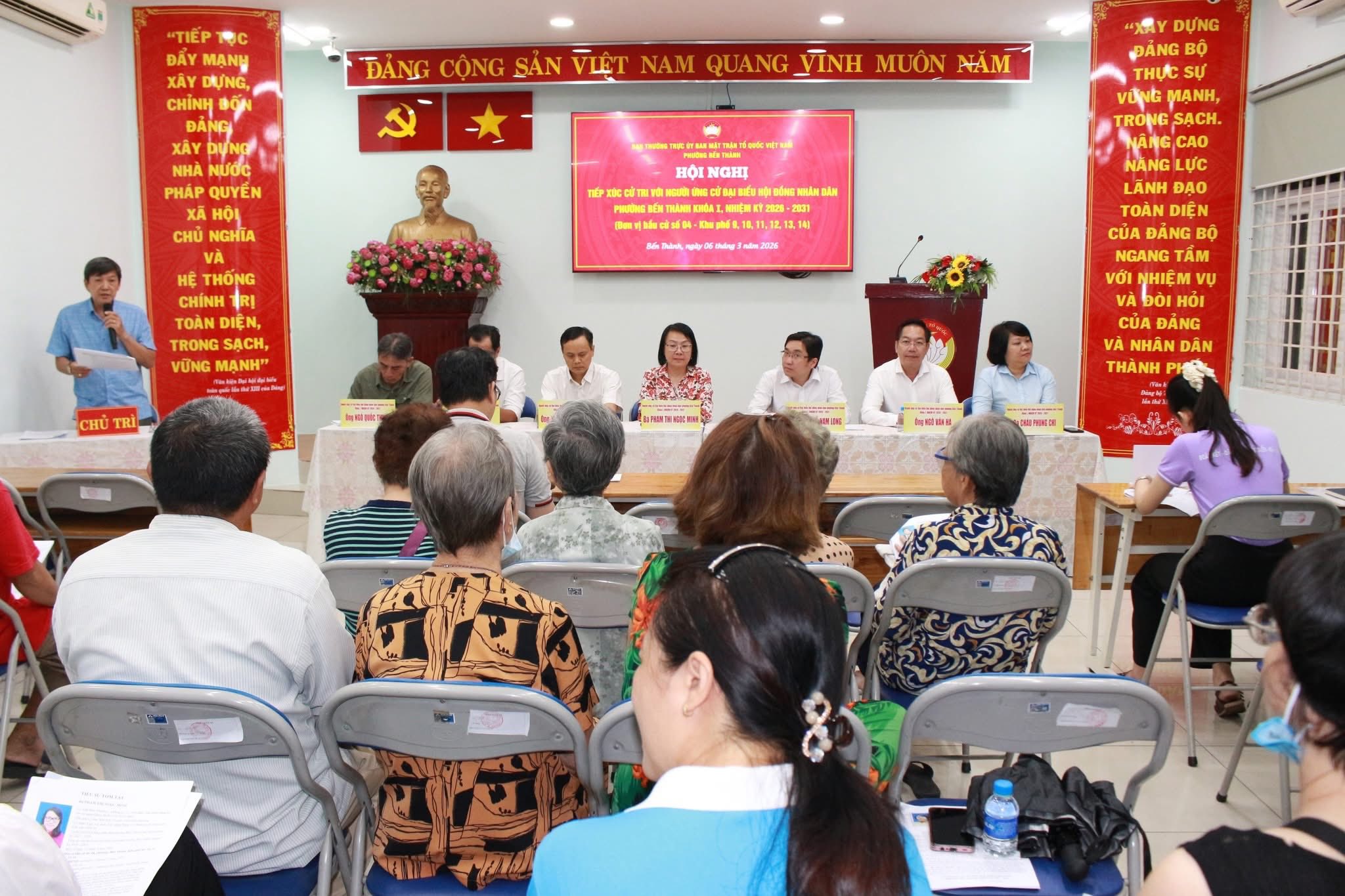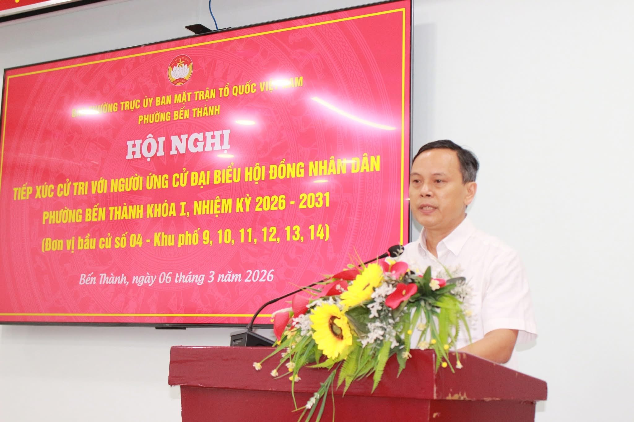 Tối 6/3, tại trụ sở Ủy ban MTTQ phường Bến Thành, Ban Thường trực Ủy ban MTTQ Việt Nam phường Bến Thành tổ chức hội nghị tiếp xúc cử tri với người ứng cử đại biểu Hội đồng nhân dân (HĐND) phường Bến Thành khóa I, nhiệm kỳ 2026 – 2031 (đơn vị bầu cử số 4) với cử tri Khu phố 9.