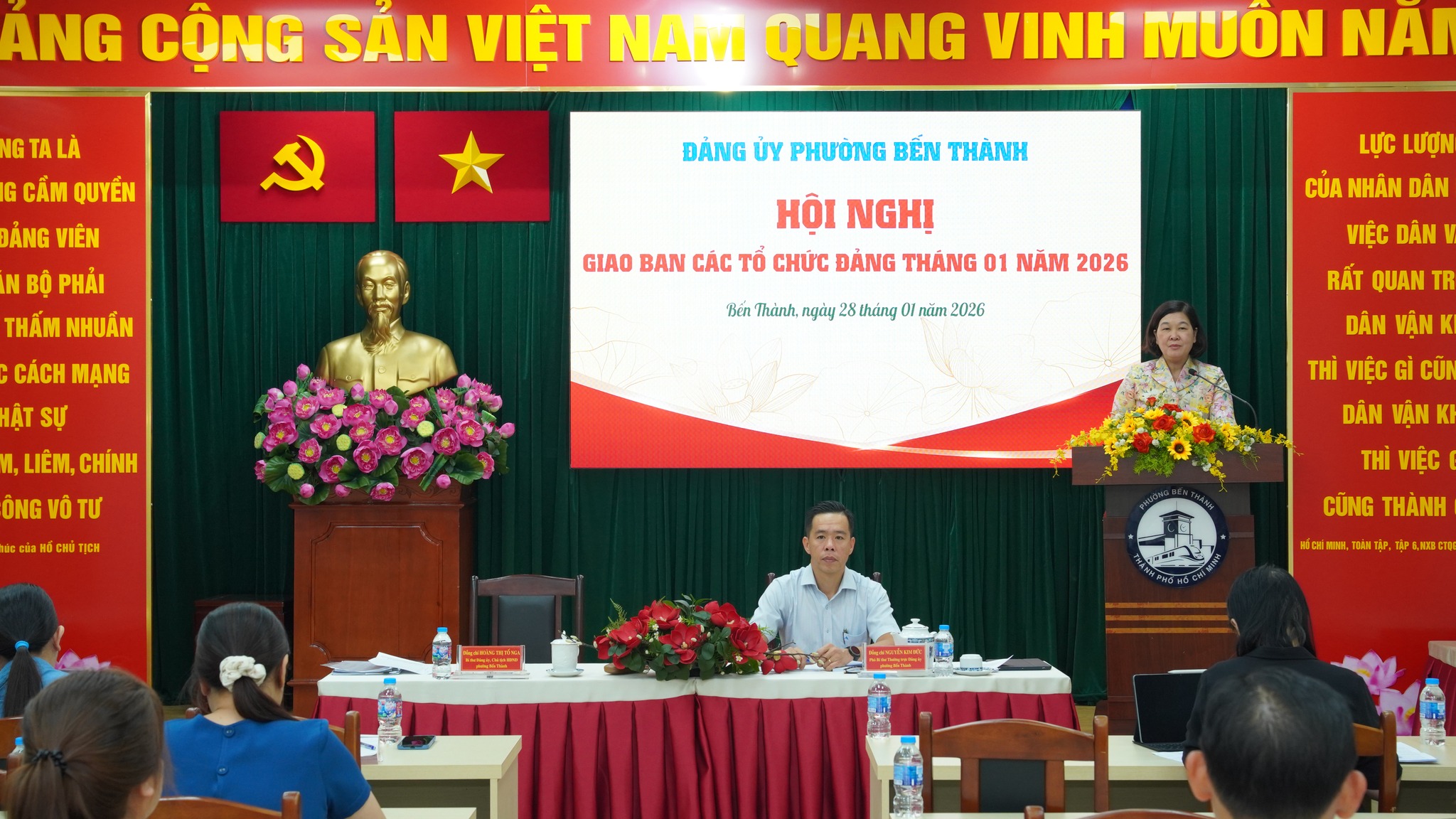 Ngày 28/1, Đảng ủy phường Bến Thành tổ chức hội nghị giao ban các tổ chức đảng tháng 1 năm 2026. Các đồng chí: Hoàng Thị Tố Nga, Bí thư Đảng ủy, Chủ tịch HĐND phường và Nguyễn Kim Đức, Phó Bí thư Thường trực Đảng ủy phường chủ trì hội nghị.