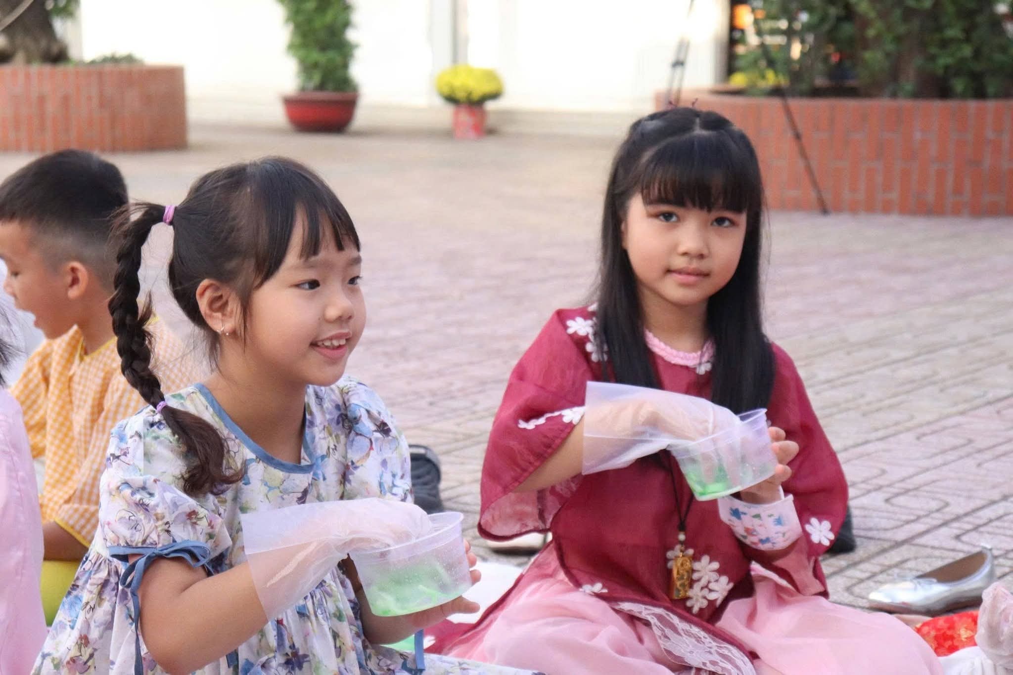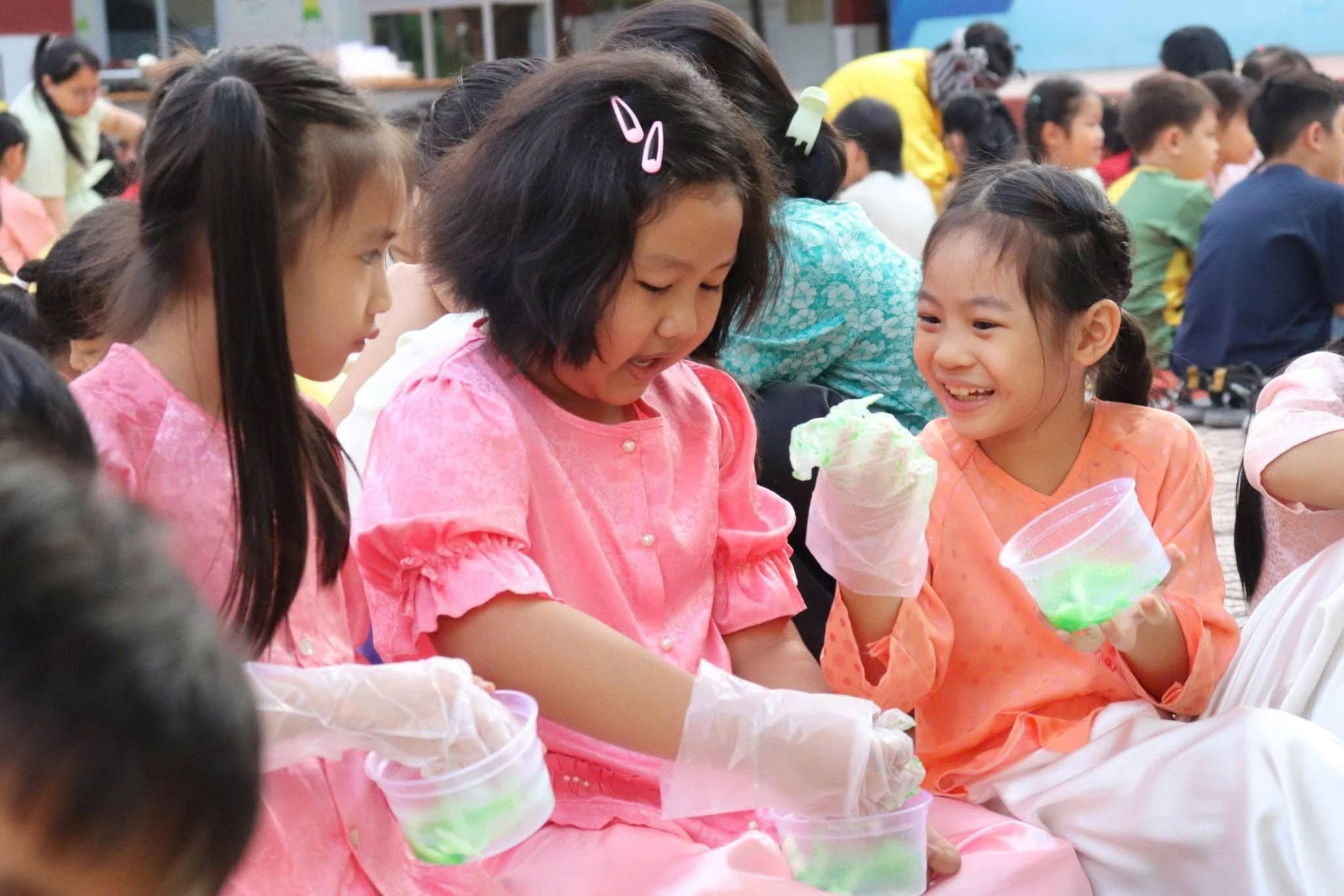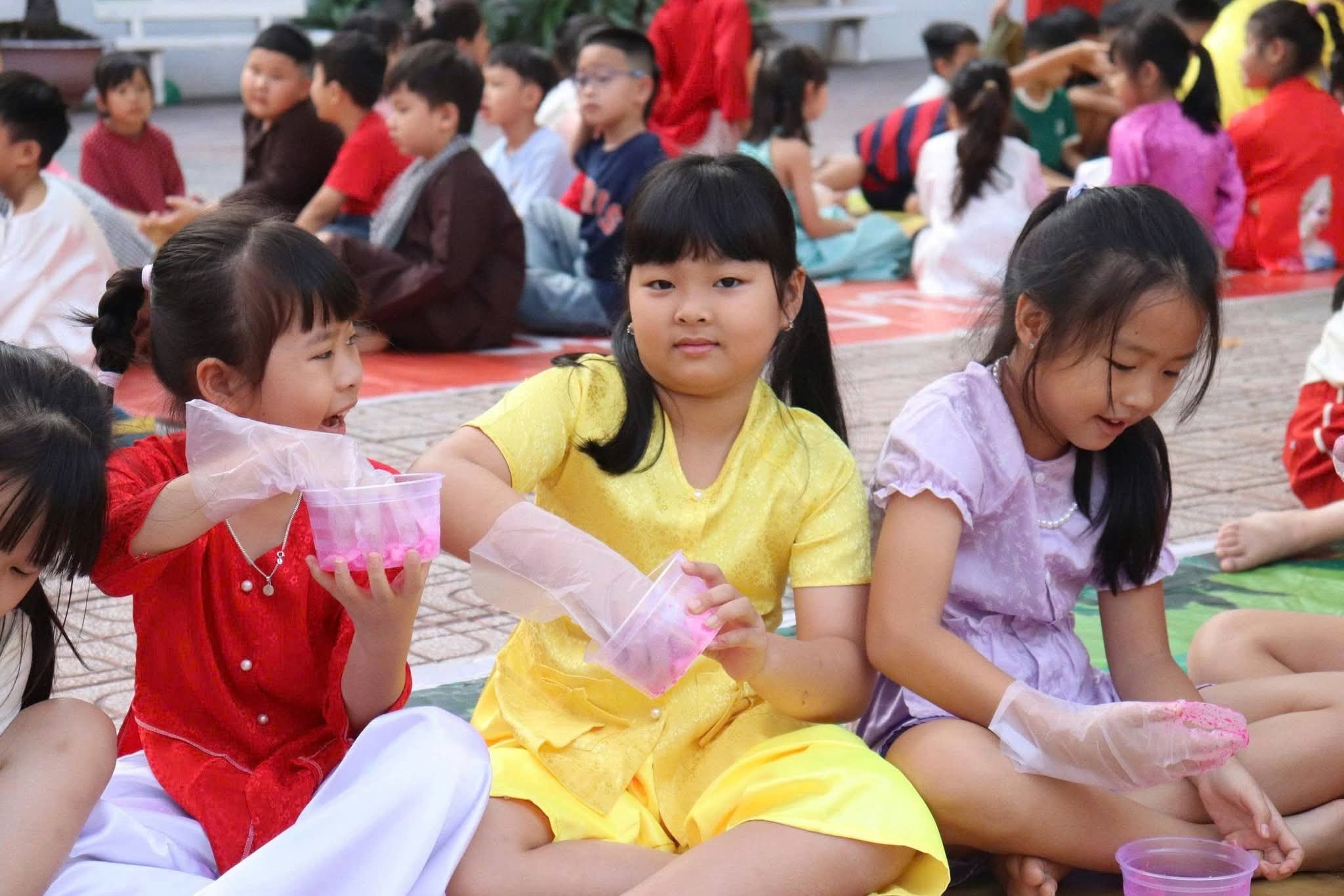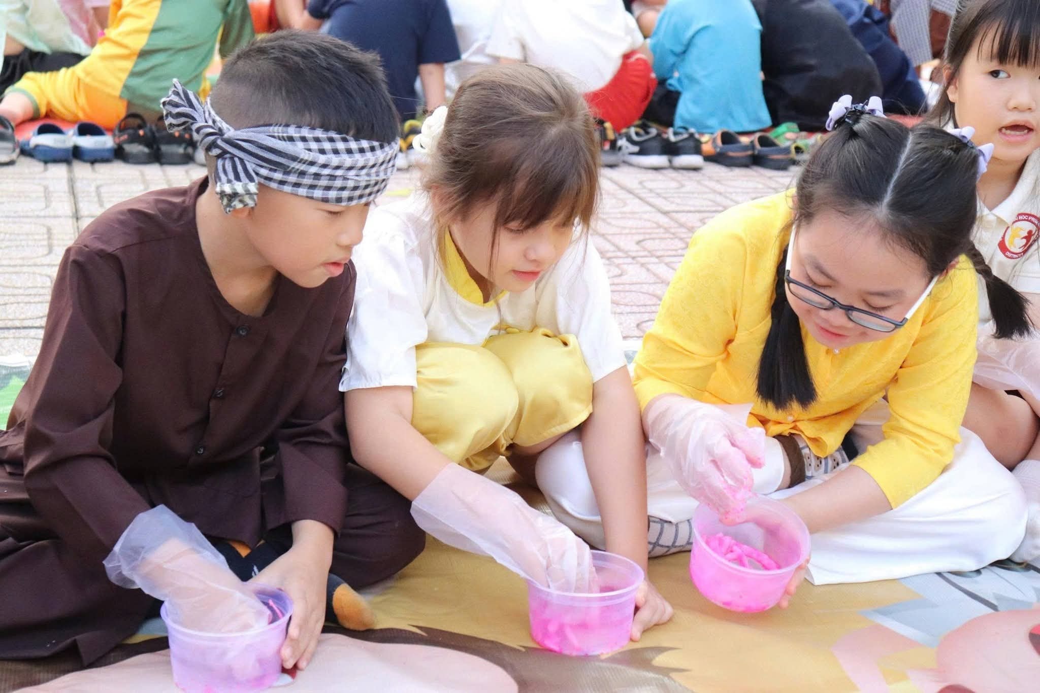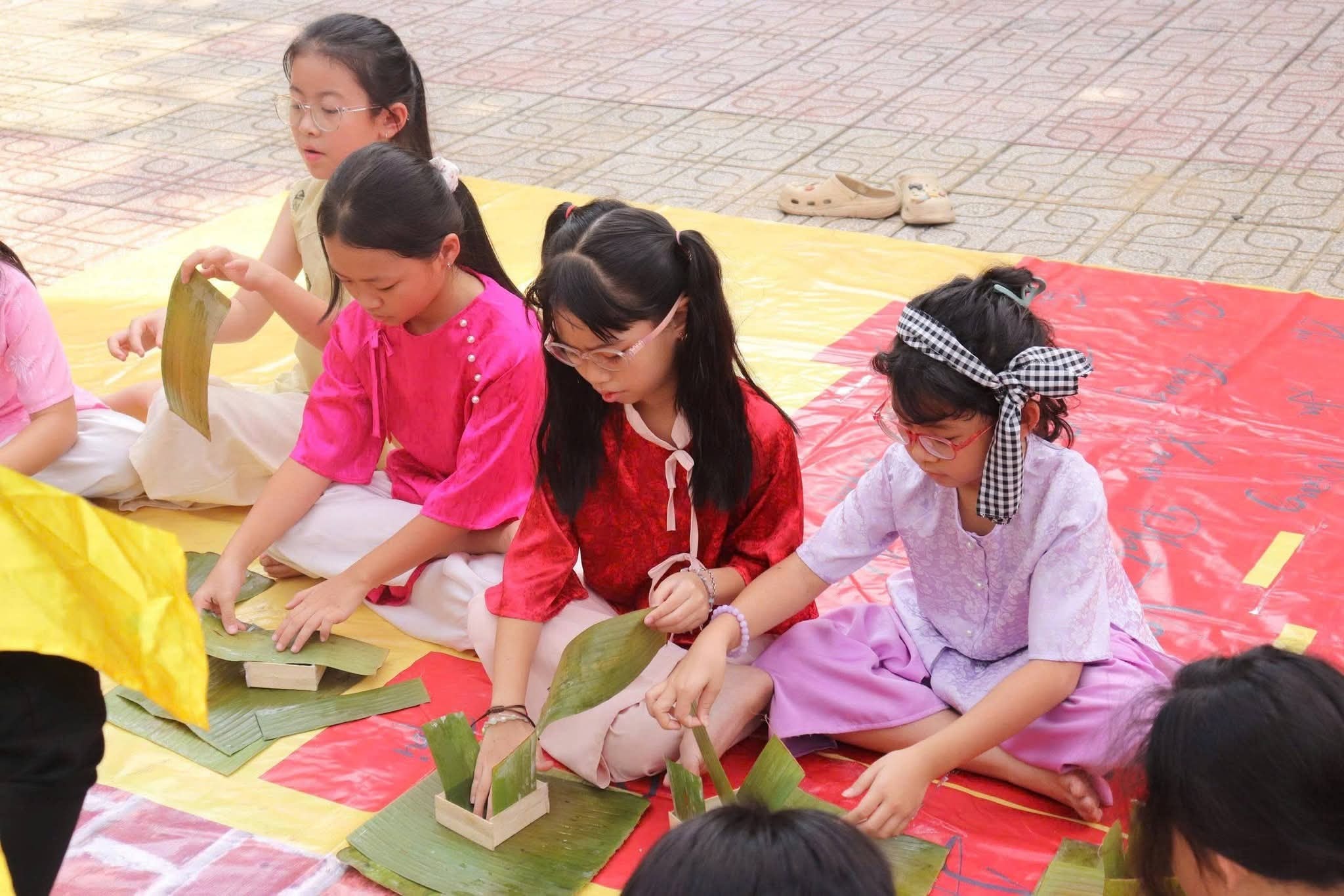 ​Không gian nhà trường bỗng chốc trở thành một “xưởng bánh mứt” nhộn nhịp, nơi mùi thơm của nếp mới, lá dong hòa quyện cùng hương vị ngọt ngào của món mứt dừa. Những đôi bàn tay nhỏ bỗng trở nên khéo léo lạ thường. Các em chăm chú học cách xếp lá dong, đong gạo nếp, đặt nhân đỗ xanh và buộc những sợi lạt mềm mại để tạo nên những chiếc bánh vuông vắn, mứt Tết ngọt ngào đượm vị quê hương bên những chiếc bếp lửa hồng, tiếng cười nói rộn rã hòa cùng tiếng sên mứt lách tách.