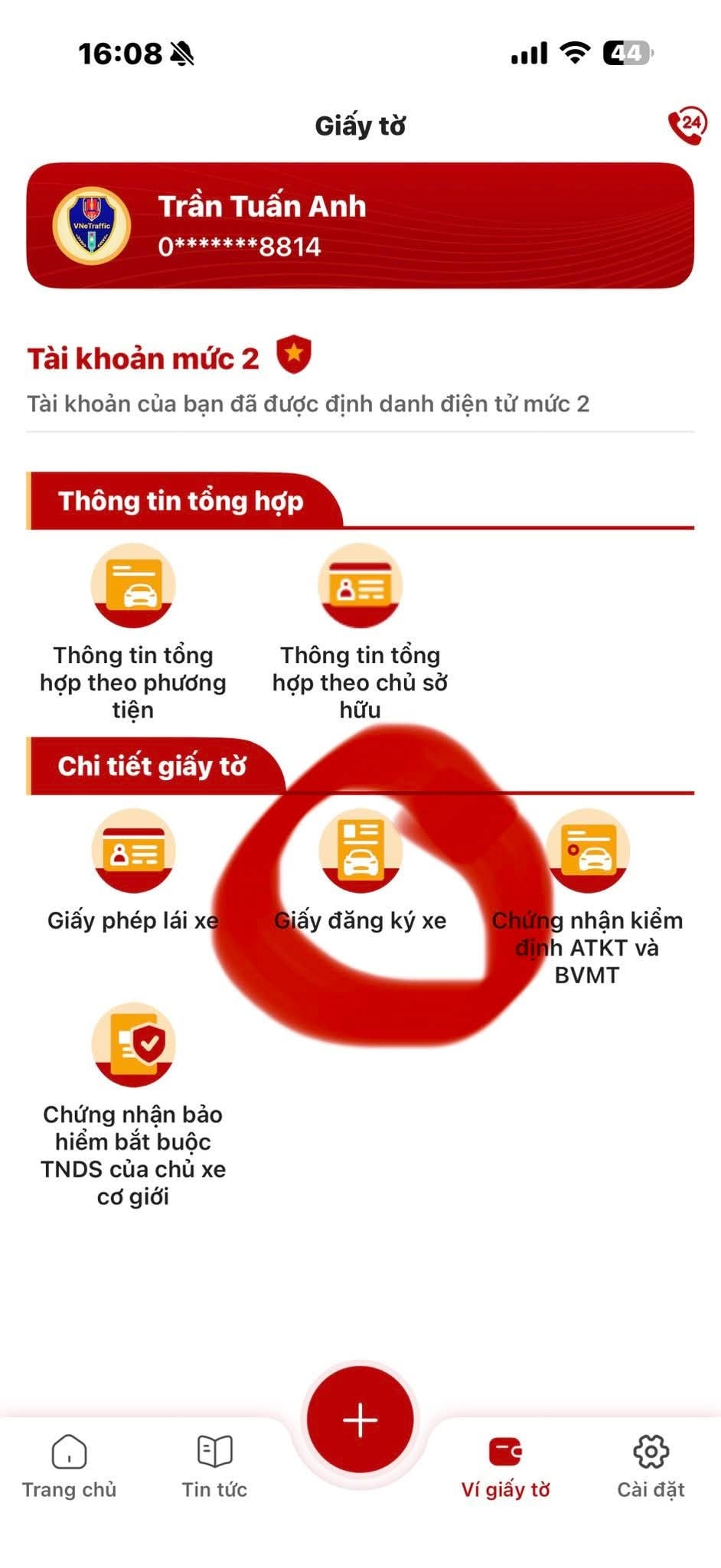 Bước 2: Tại màn hình chính, chọn mục “Ví giấy tờ”, sau đó chọn “Giấy đăng ký xe” và nhập passcode.