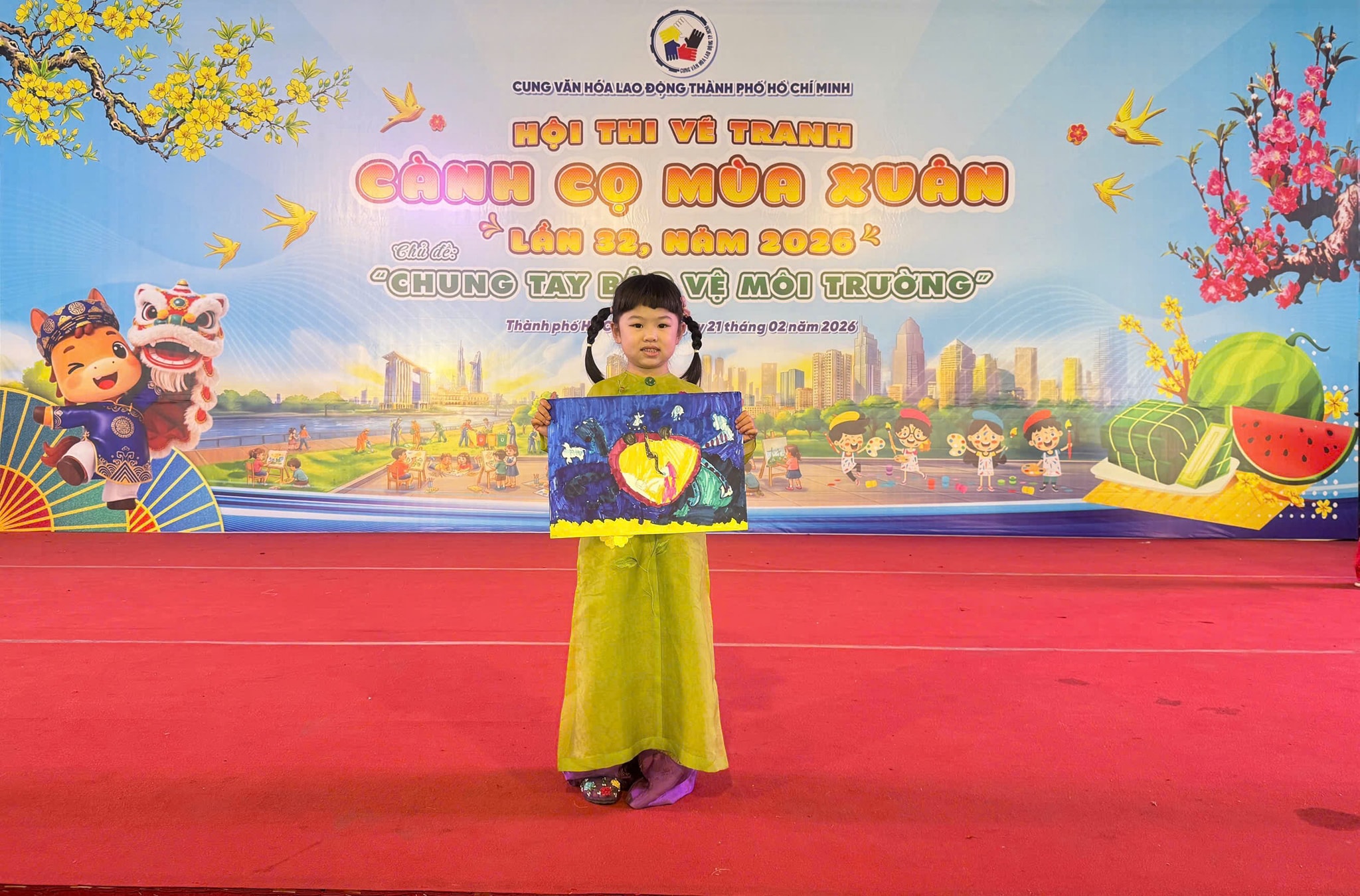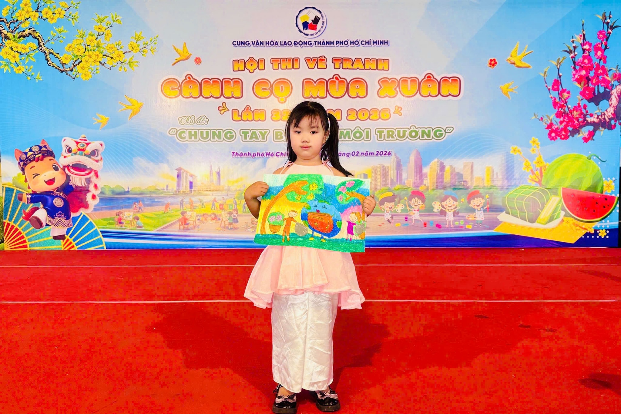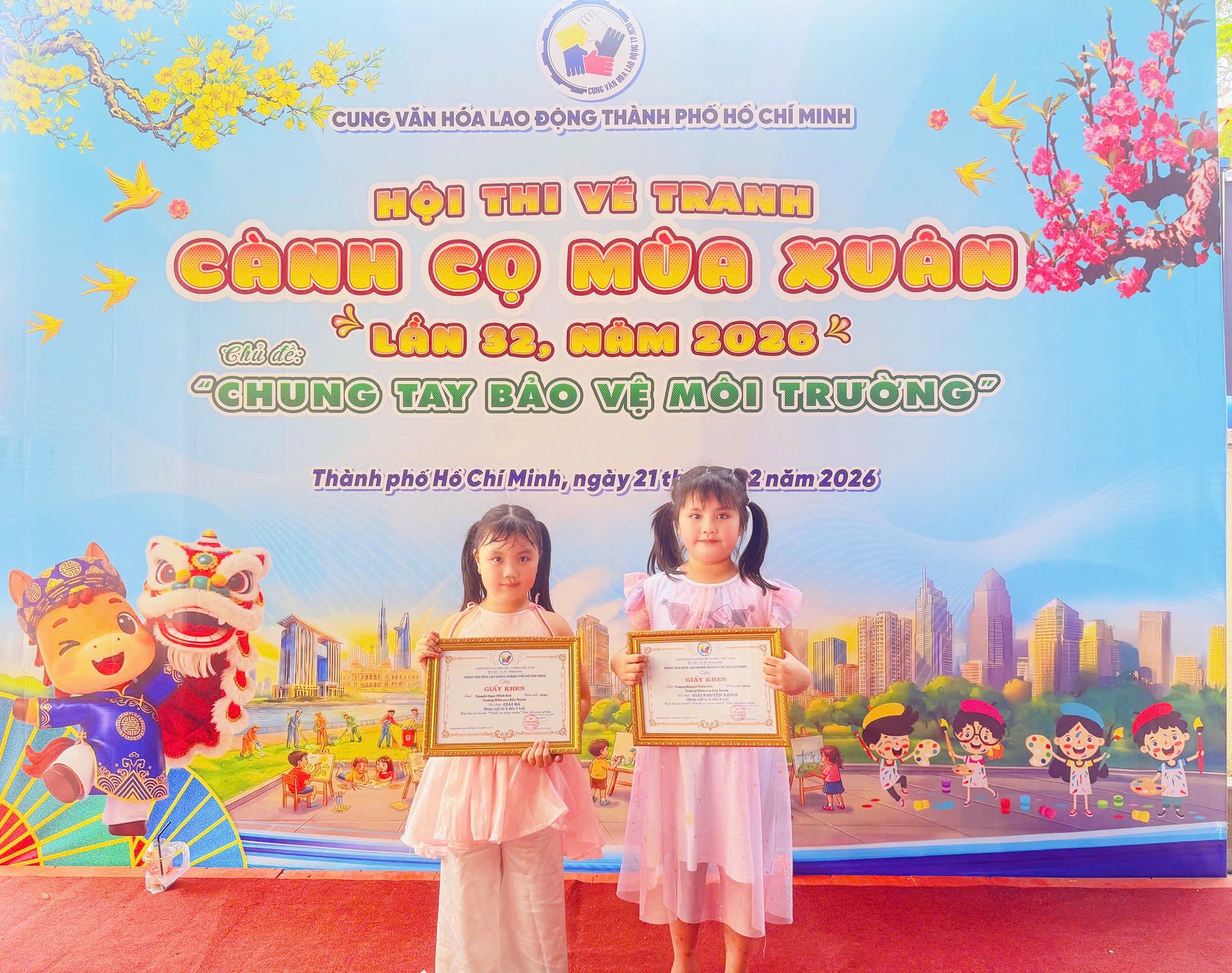 Nhà trường có 04 bé đại diện tham gia hội thi. Với sự tự tin, sáng tạo và tình yêu hội họa, các bé đã thể hiện những bức tranh sinh động, giàu màu sắc và thông điệp tích cực về mùa Xuân và cuộc sống quanh em.