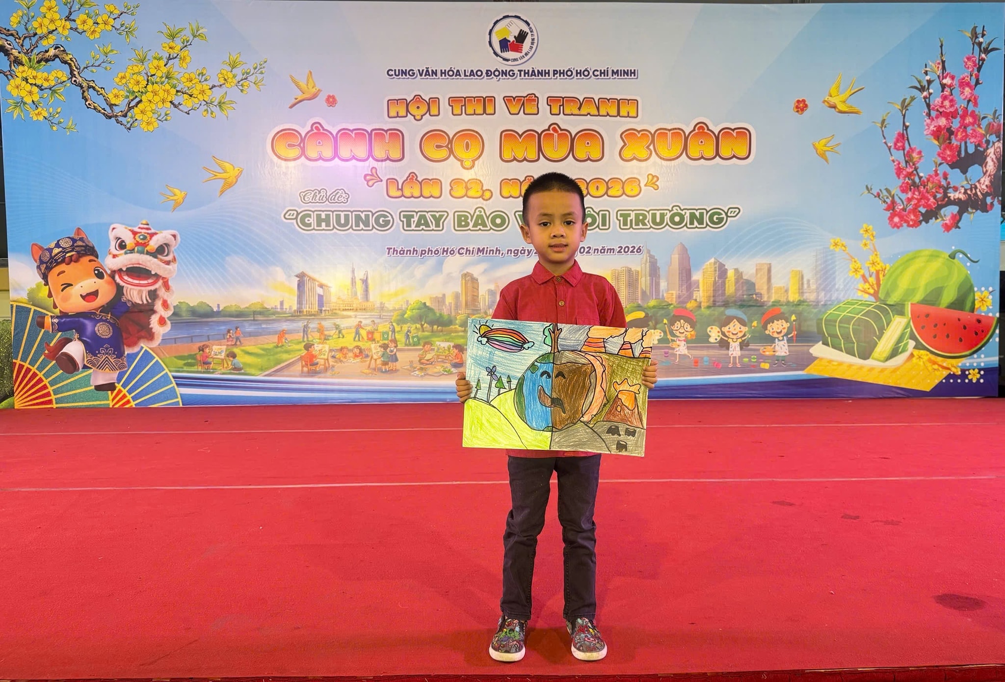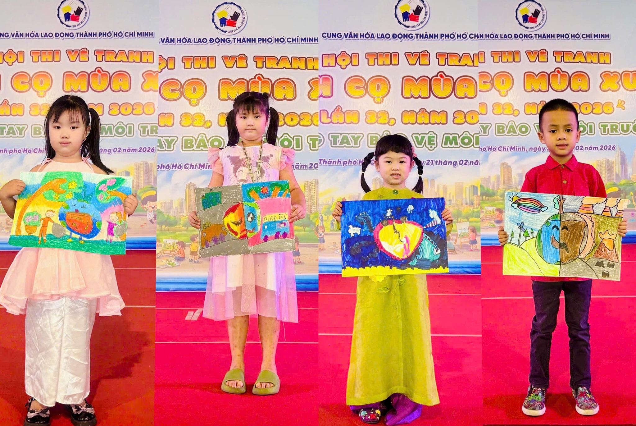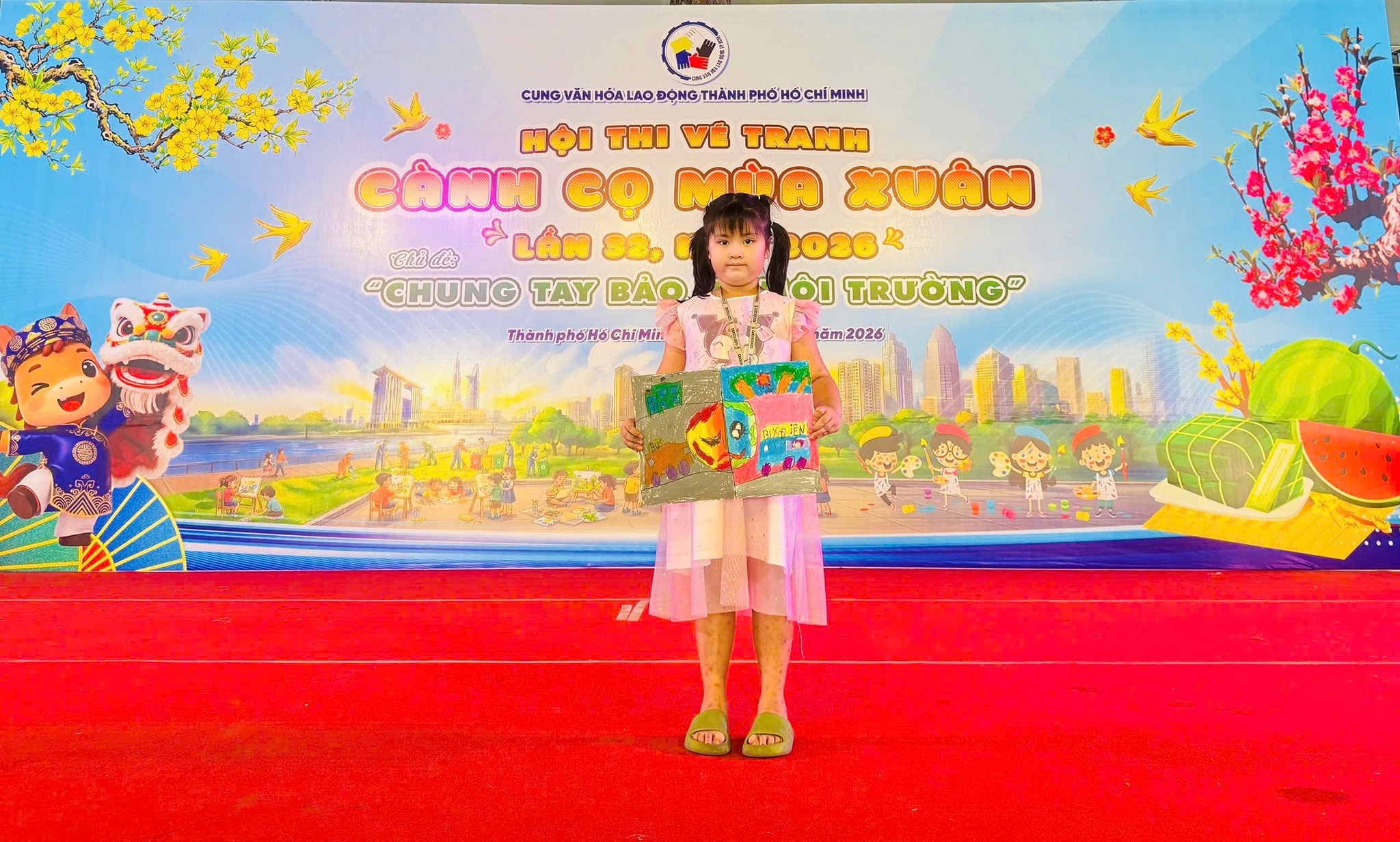 Nhà trường có 04 bé đại diện tham gia hội thi. Với sự tự tin, sáng tạo và tình yêu hội họa, các bé đã thể hiện những bức tranh sinh động, giàu màu sắc và thông điệp tích cực về mùa Xuân và cuộc sống quanh em.