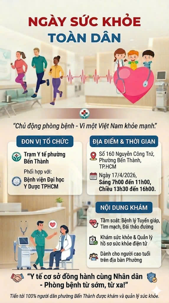 Trong ngày 17/4/2026, Sáng từ 7g00 đến 11g00, Chiều từ 13g30 đến 16g00 tại Điểm 01 của Trạm Y tế phường Bến Thành số 160 Nguyễn Công Trứ phường Bến Thành, cùng với sự đồng hành của đội ngũ y, bác sỹ bệnh viện Đại học Y Dược TPHCM, Trạm y tế sẽ thực hiện việc khám sức khỏe và quản lý hồ sơ sức khỏe điện tử theo chỉ đạo của Uỷ ban nhân dân TPHCM, tiến tới 100% người dân của địa bàn phường Bến Thành được khám và quản lý sức khỏe.