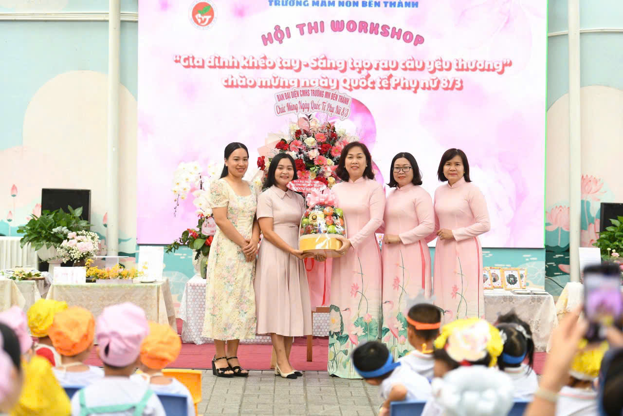 Đặc biệt, trong chương trình, Ban đại diện Cha mẹ học sinh Trường Mầm non Bến Thành đã gửi tặng hoa và quà chúc mừng đến tập thể nhà trường nhân dịp Ngày Quốc tế Phụ nữ 8/3, thể hiện tình cảm trân trọng và sự gắn bó giữa phụ huynh với nhà trường.