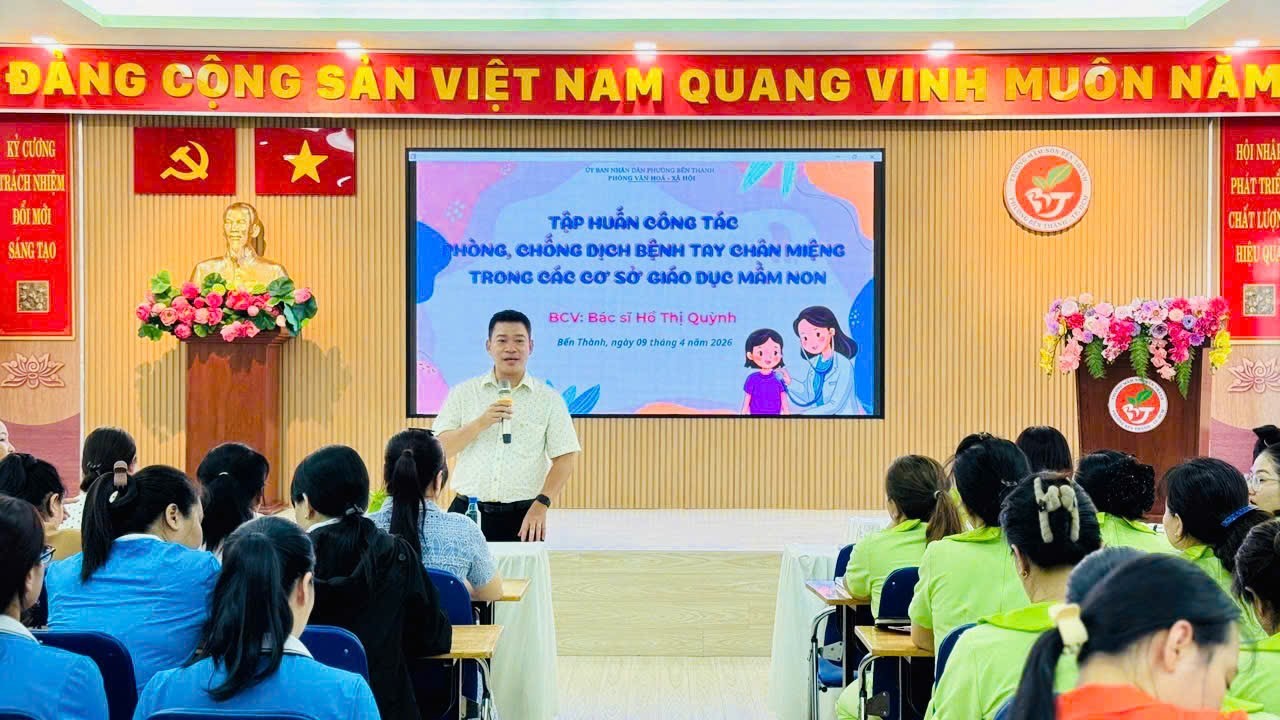 Chiều ngày 08/4/2026, tại Hội trường Trường Mầm non Bến Thành, Phòng Văn hóa – Xã hội phường Bến Thành phối hợp Trạm Y tế phường đã tổ chức buổi tập huấn về công tác phòng, chống bệnh tay chân miệng trong các cơ sở giáo dục mầm non trên địa bàn.