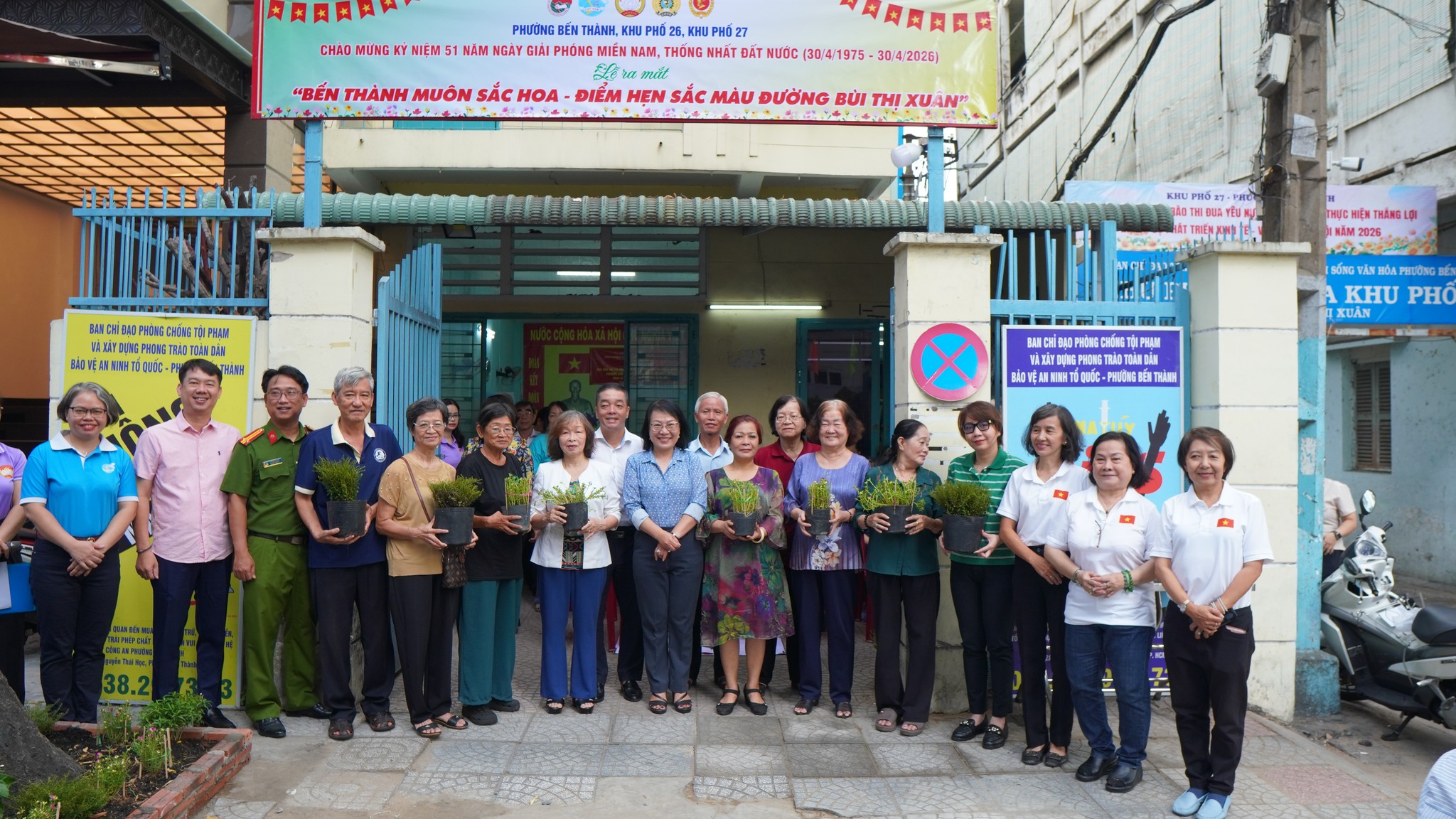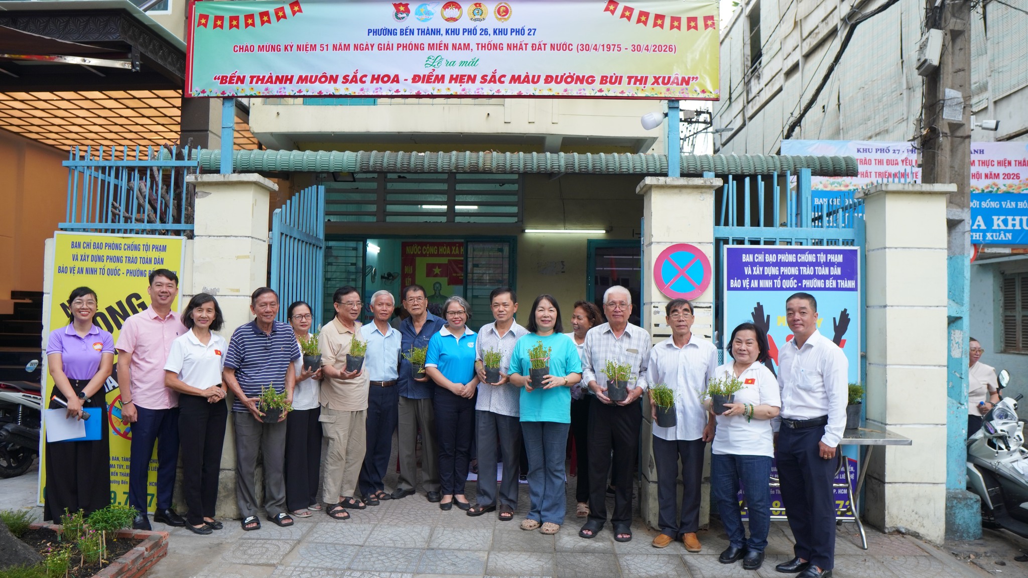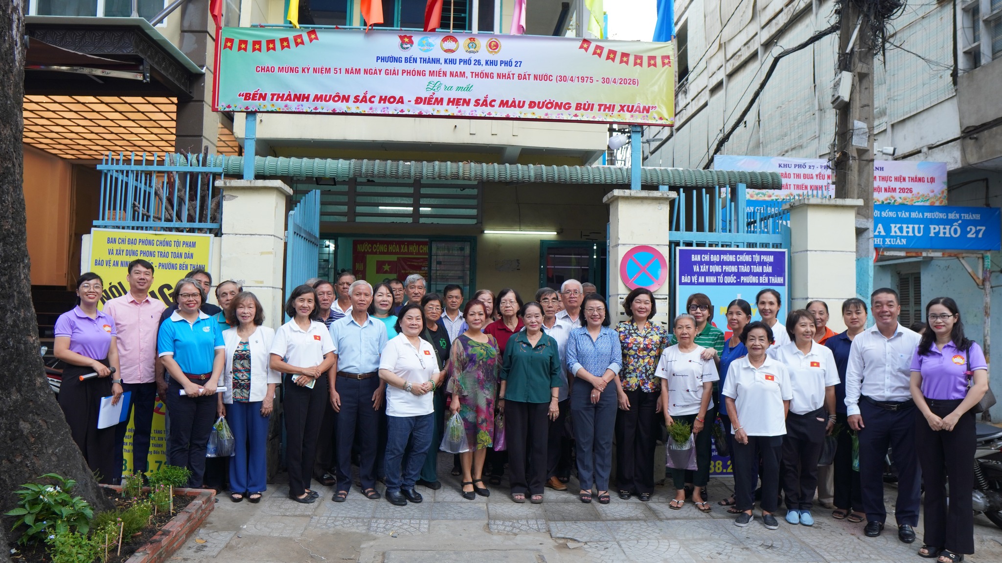 Đại diện Khu phố 26 và Khu phố 27, bà Nguyễn Thị Ngọc Cẩm, Trưởng Khu phố 27 cho biết: Nhằm thiết thực tổ chức các hoạt động chào mừng kỷ niệm 51 năm Ngày Giải phóng miền Nam, thống nhất đất nước (30/4/1975 – 30/4/2026); gắn với thực hiện các phong trào thi đua yêu nước và hoạt động môi trường sống xanh – sạch – đẹp, nâng cao chất lượng đời sống và tạo diện mạo khang trang cho 2 khu phố 26 và 27, Ban Công tác Mặt trận Khu phố 26 và 27 phát động thực hiện công trình: “Bến Thành muôn sắc hoa – Điểm hẹn sắc màu đường Bùi Thị Xuân” (đoạn từ Tôn Thất Tùng đến Cống Quỳnh), công trình thực hiện từ ngày 6/4/2026 đến nay đã hoàn thành với nguồn kinh phí khoảng 40.000.000 đồng: xây dựng 24 bồn hoa trên dọc tuyến đường và trồng 150 cây hoa mười giờ, 80 cây hoa lài trâu, 100 cây Mai cẩm tú, 40 cây Mai vạn phúc, 40 cây Thanh xà…, với sự tham gia góp sức của các đồng chí đảng viên trong chi bộ, các đoàn thể khu phố, hội viên, các cơ sở kinh doanh và Nhân dân cùng chung tay đóng góp, thể hiện tinh thần đoàn kết, trách nhiệm vì lợi ích chung của cộng đồng.