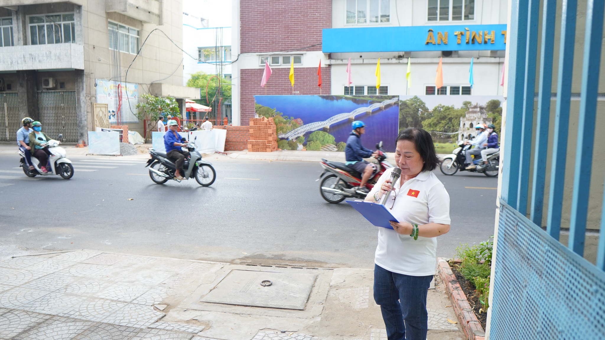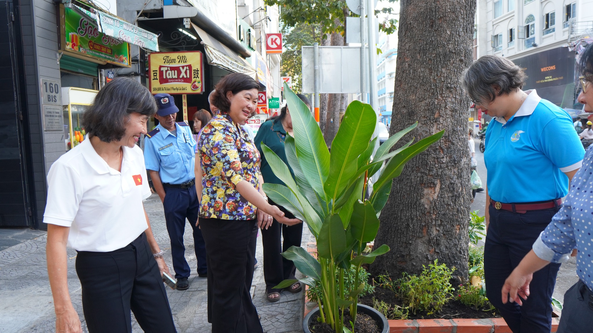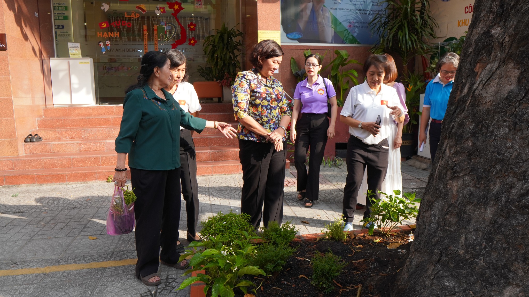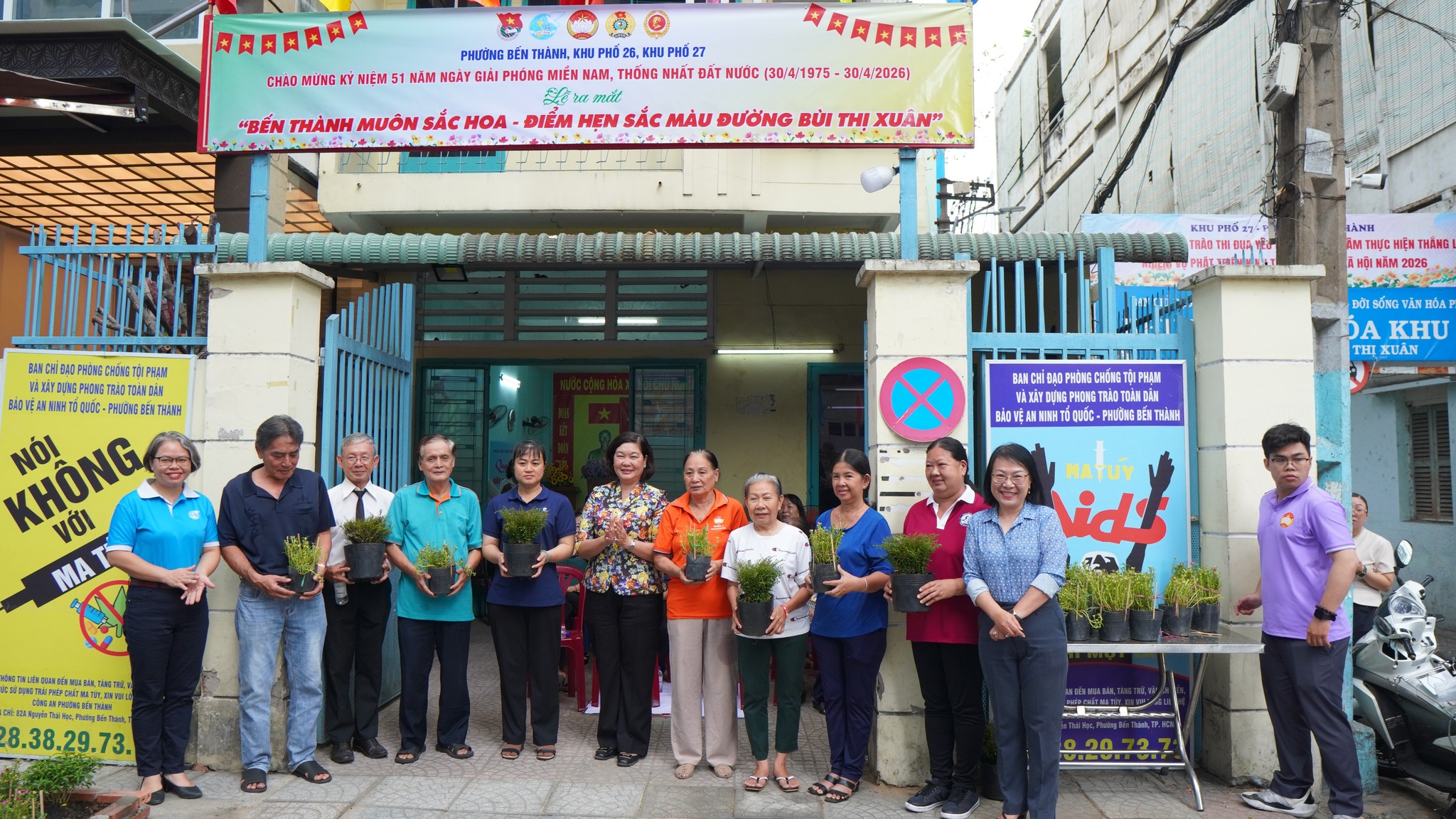 Đại diện Khu phố 26 và Khu phố 27, bà Nguyễn Thị Ngọc Cẩm, Trưởng Khu phố 27 cho biết: Nhằm thiết thực tổ chức các hoạt động chào mừng kỷ niệm 51 năm Ngày Giải phóng miền Nam, thống nhất đất nước (30/4/1975 – 30/4/2026); gắn với thực hiện các phong trào thi đua yêu nước và hoạt động môi trường sống xanh – sạch – đẹp, nâng cao chất lượng đời sống và tạo diện mạo khang trang cho 2 khu phố 26 và 27, Ban Công tác Mặt trận Khu phố 26 và 27 phát động thực hiện công trình: “Bến Thành muôn sắc hoa – Điểm hẹn sắc màu đường Bùi Thị Xuân” (đoạn từ Tôn Thất Tùng đến Cống Quỳnh), công trình thực hiện từ ngày 6/4/2026 đến nay đã hoàn thành với nguồn kinh phí khoảng 40.000.000 đồng: xây dựng 24 bồn hoa trên dọc tuyến đường và trồng 150 cây hoa mười giờ, 80 cây hoa lài trâu, 100 cây Mai cẩm tú, 40 cây Mai vạn phúc, 40 cây Thanh xà…, với sự tham gia góp sức của các đồng chí đảng viên trong chi bộ, các đoàn thể khu phố, hội viên, các cơ sở kinh doanh và Nhân dân cùng chung tay đóng góp, thể hiện tinh thần đoàn kết, trách nhiệm vì lợi ích chung của cộng đồng.
