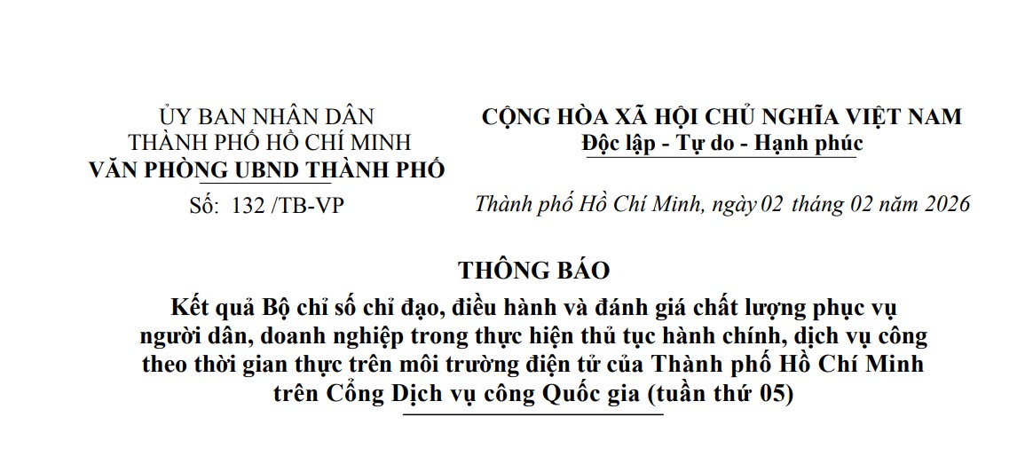 Thông báo Kết quả Bộ chỉ số chỉ đạo, điều hành và đánh giá chất lượng phục vụ người dân, doanh nghiệp trong thực hiện thủ tục hành chính, dịch vụ công theo thời gian thực trên môi trường điện tử của Thành phố Hồ Chí Minh trên Cổng Dịch vụ công Quốc gia (tuần thứ 05)