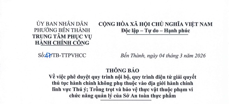 Thông báo số 47 về việc phê duyệt quy trình nội bộ, quy trình điện tử giải quyết thủ tục hành chính không phụ thuộc vào địa giới hành chính lĩnh vực Thú ý; Trồng trọt và bảo vệ thực vật thuộc phạm vi chức năng quản lý của Sở An toàn thực phẩm