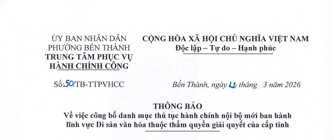 Thông báo số 50 về việc công bố danh mục thủ tục hành chính nội bộ mới ban hành lĩnh vực Di sản văn hóa thuộc thẩm quyền giải quyết của cấp tỉnh 18 Tháng 3, 2026