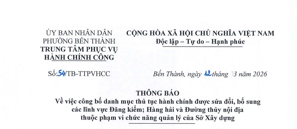 Thông báo số 54 về việc công bố danh mục thủ tục hành chính được sửa đổi, bổ sung các lĩnh vực Đăng kiêm; Hàng hải và Đường thủy nội địa thuộc phạm vi chức năng quản lý của Sở Xây dựng